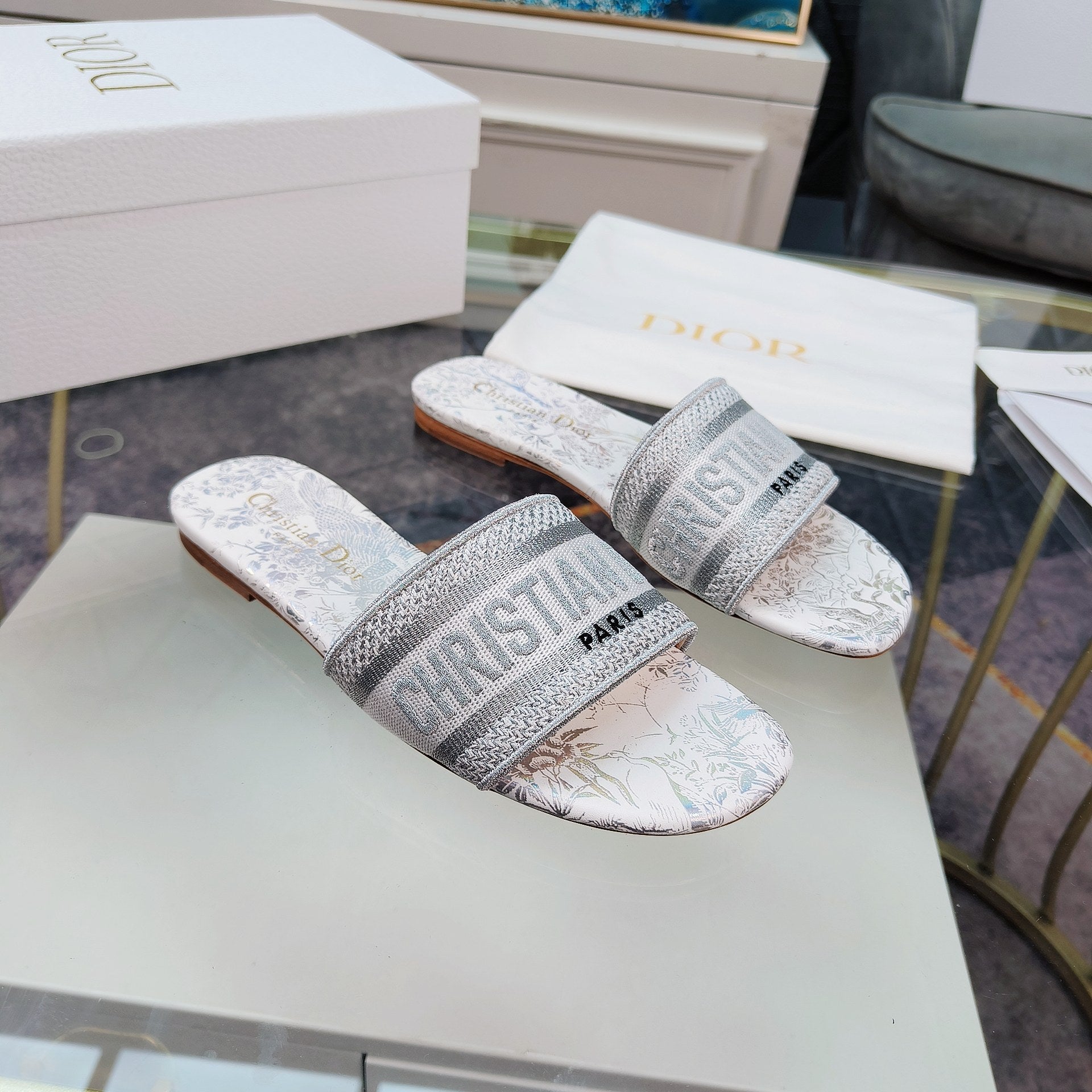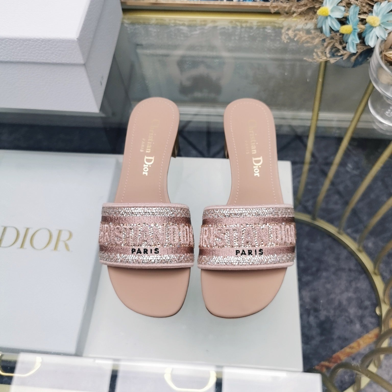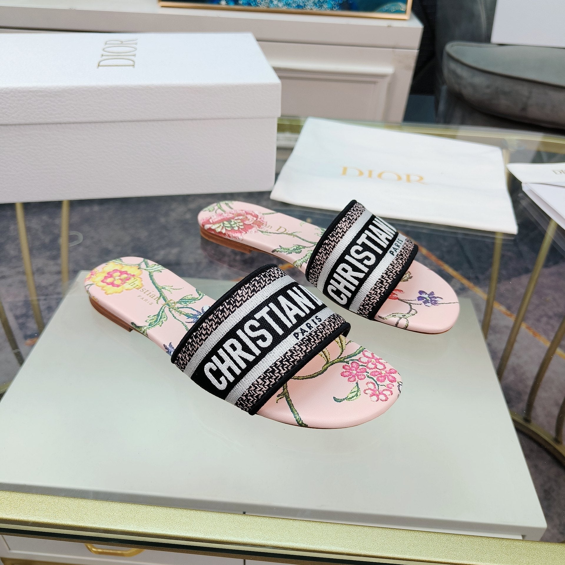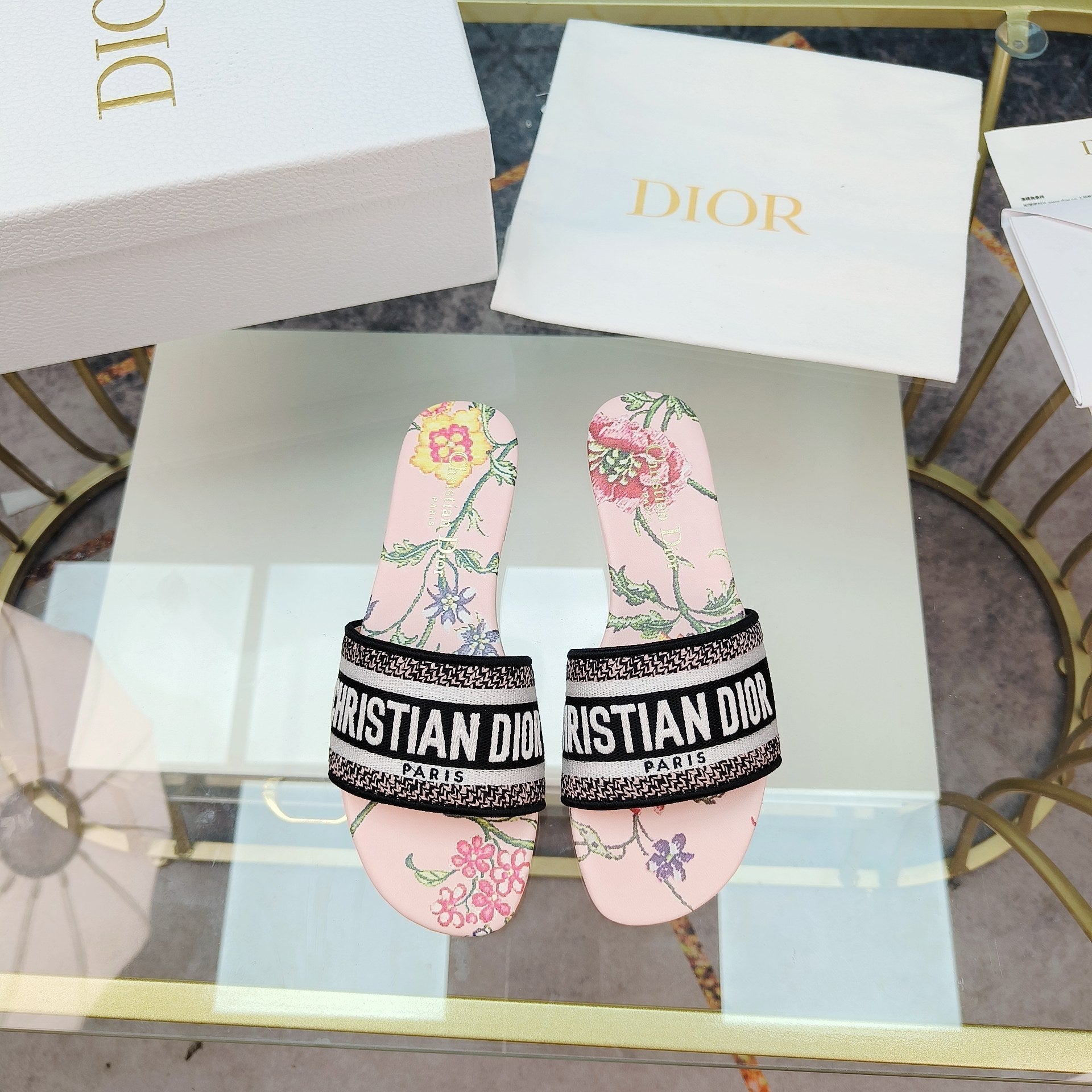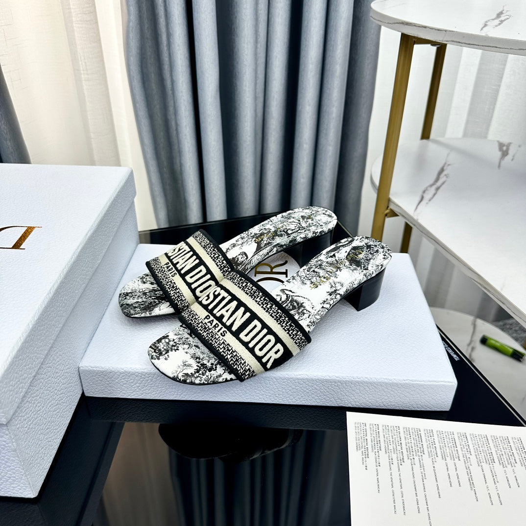 DWAY SLIDE EMBROIDERED COTTON AND LIGHT PINK MISS DIOR ALLOVER MOTIF