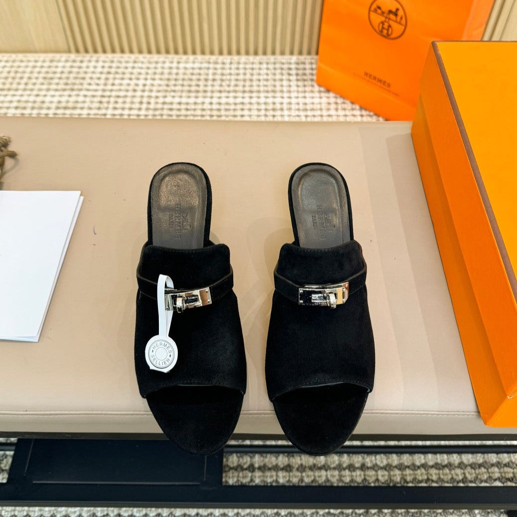 FUSSFRIEND BLACK SILK VELVET SLIDE SANDALS