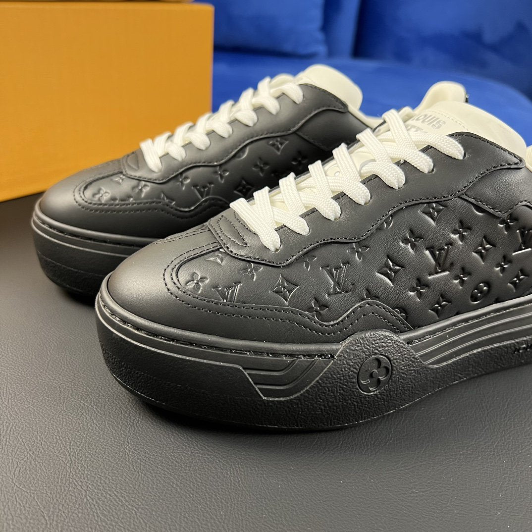 • Upper: "Made from cowhide leather, partially embossed with Monogram patterns, and stitched with a 1970s-style upper and chunky rubber sole. The Monogram flowers bloom on the lace decoration and outsole, with LV's unique logo placed on the tongue of the shoe."