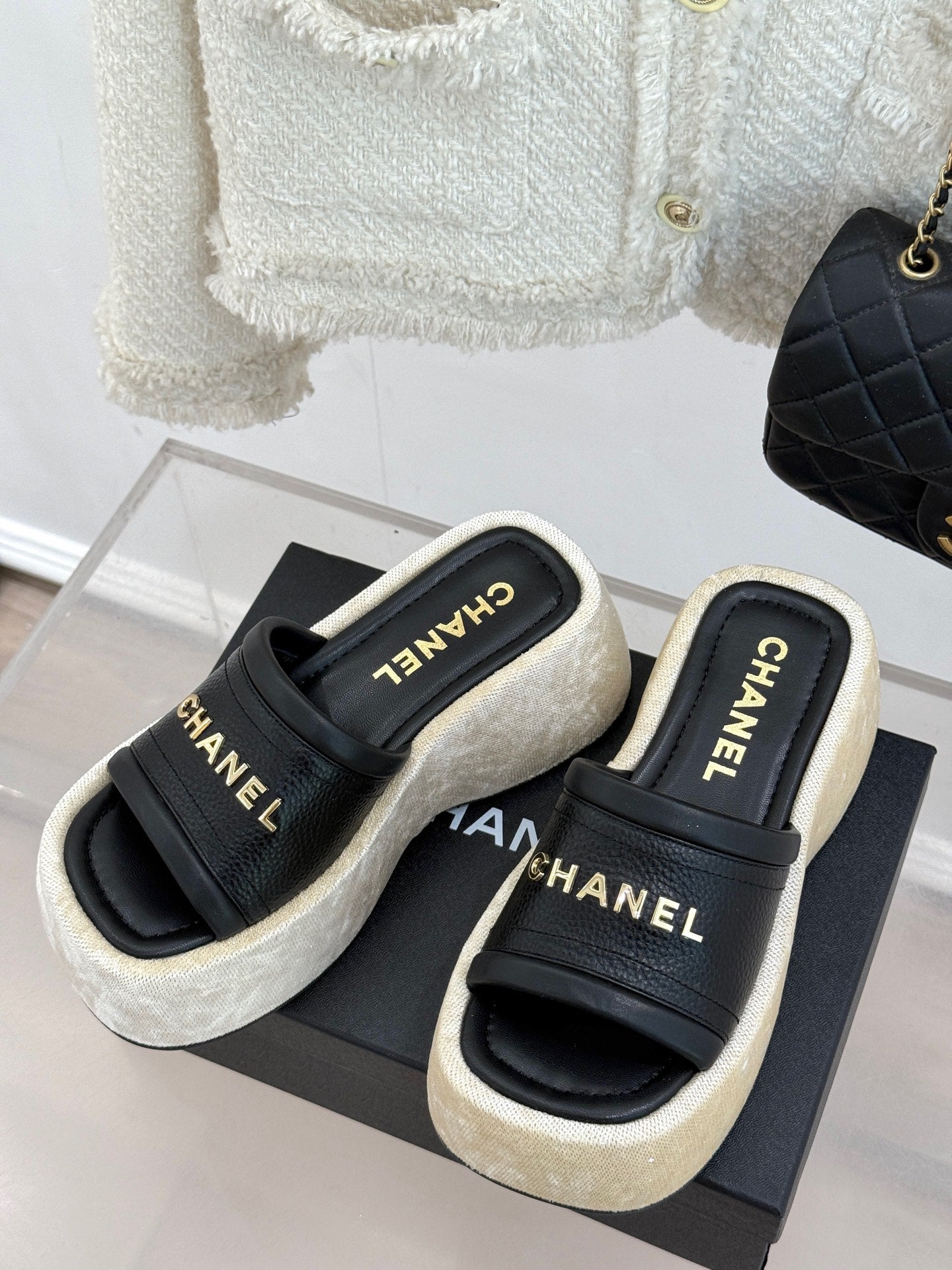PLATFORM SLIPPERS IN BLACK LAMBSKIN