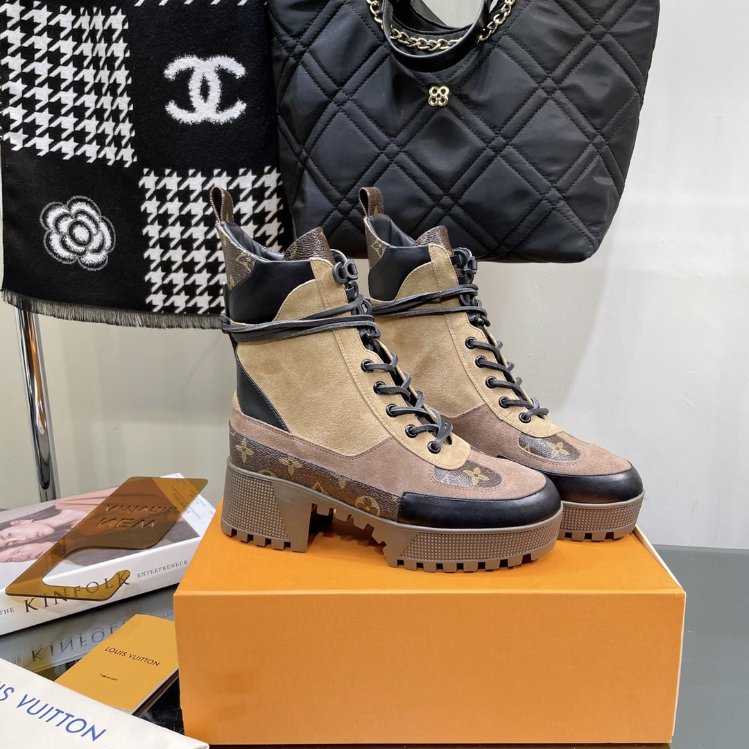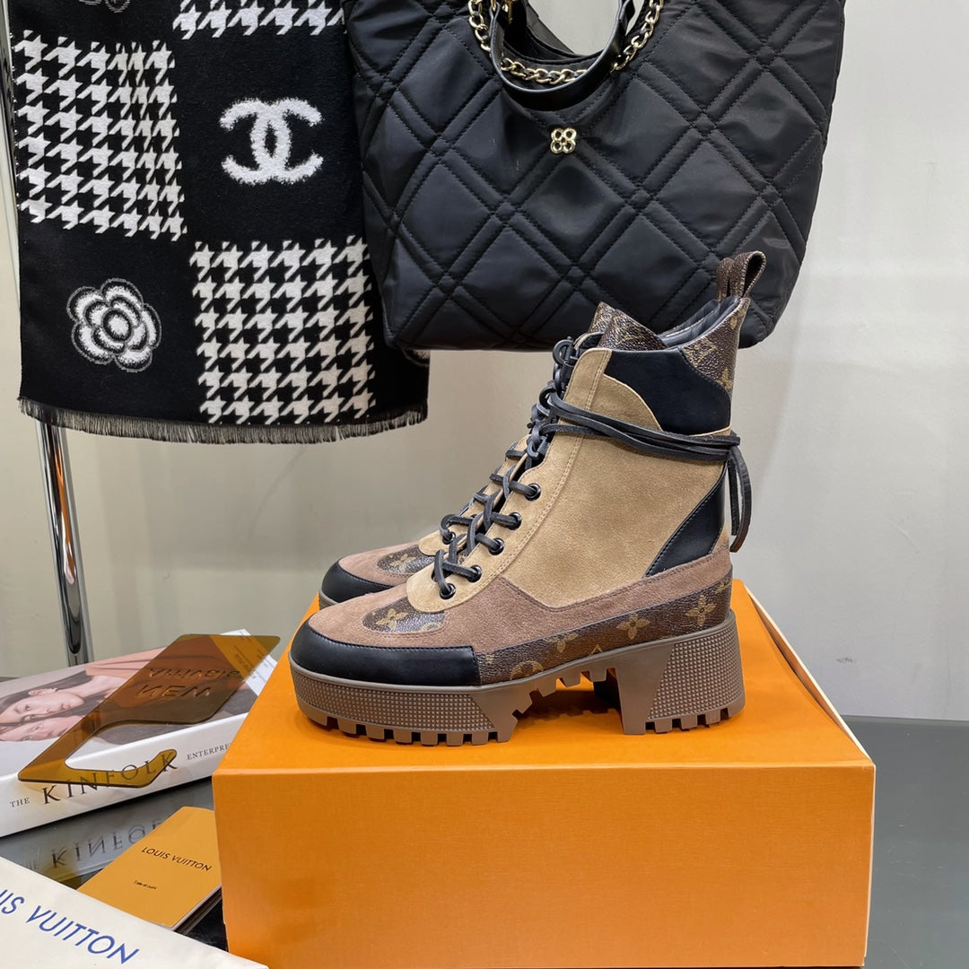 LAUREATE PLATFORM BOOTS IN COLORFUL SUEDE AND MONOGRAM CALFSKIN