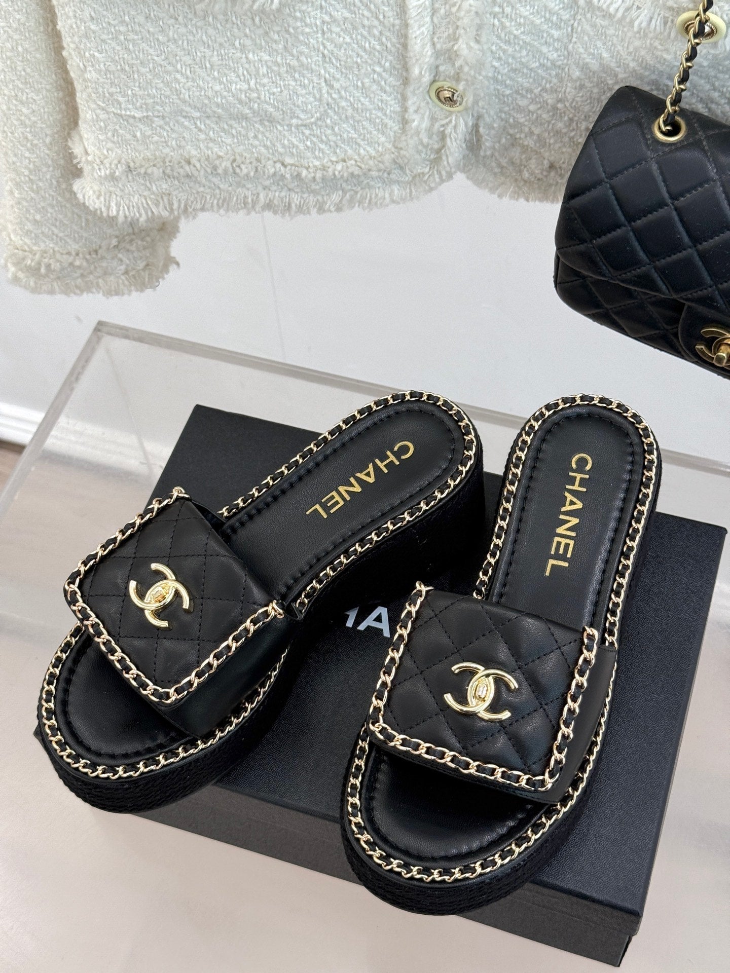 THICK-SOLED CHAIN HEART SLIPPER IN BLACK LAMBSKIN