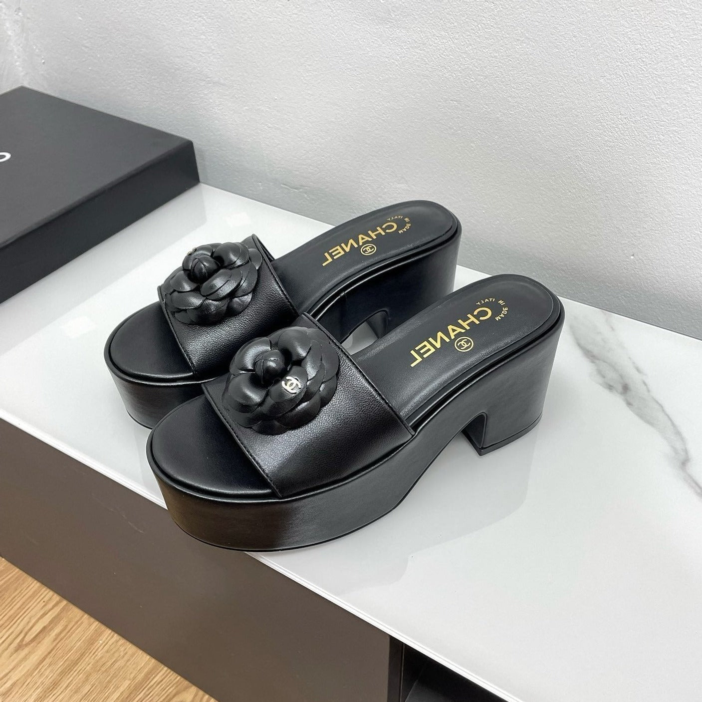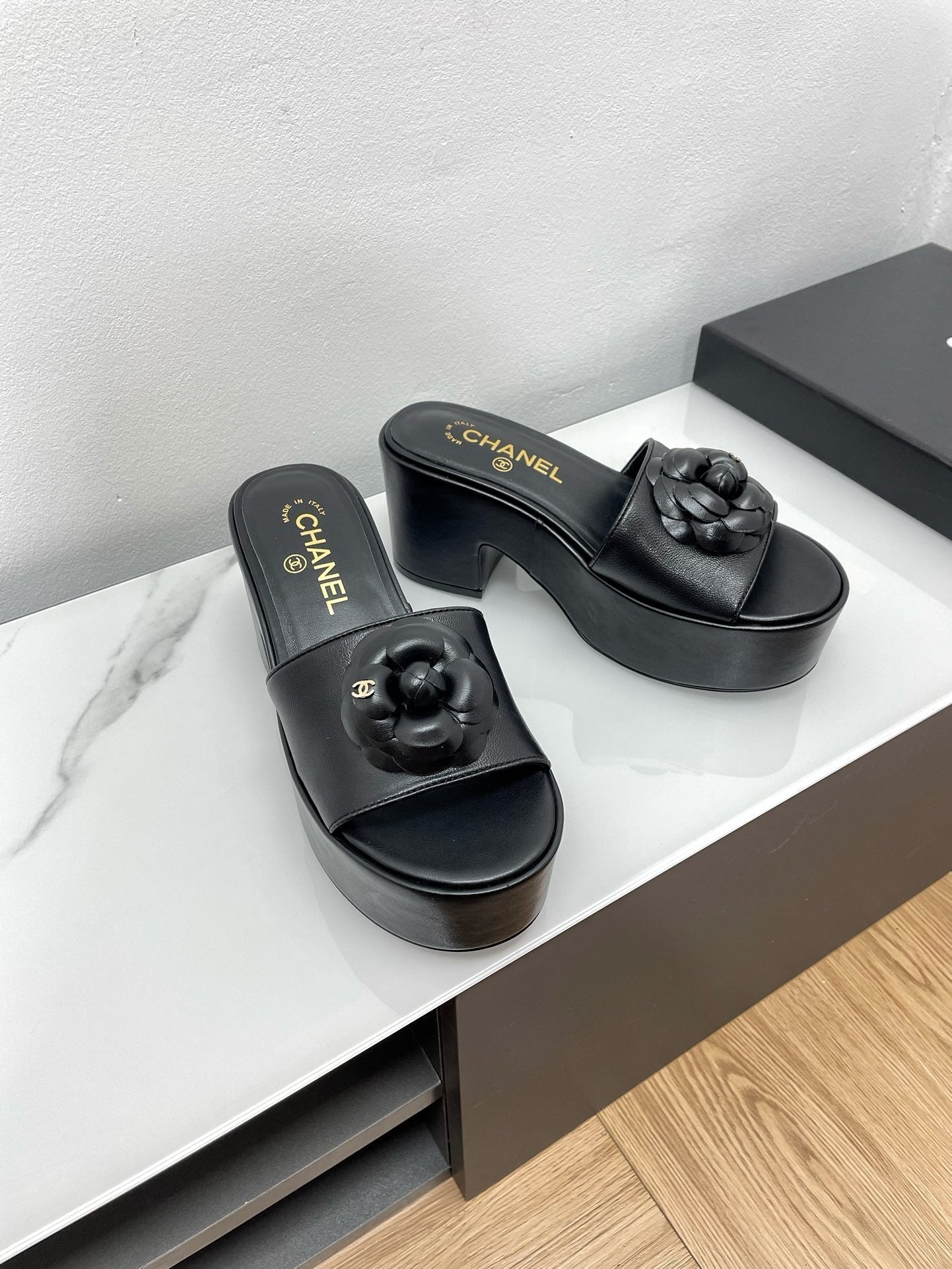 WEDGE PLATFORM BLACK LAMBSKIN WITH FLOWER