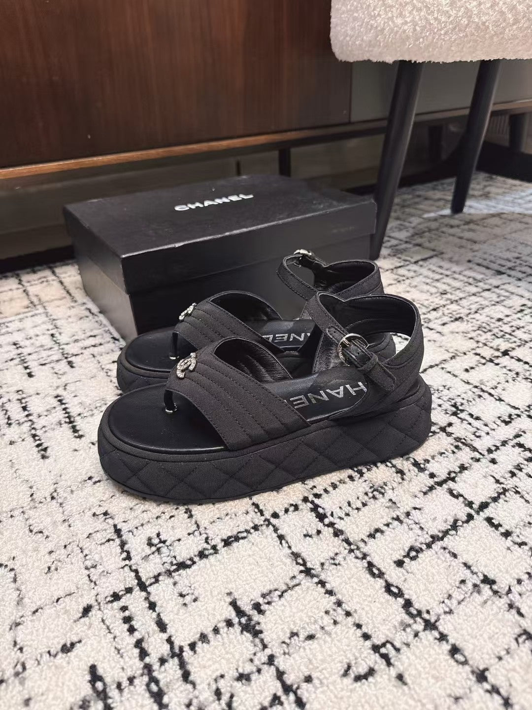 THICK-SOLED THONG SLIPPERS IN BLACK DENIM