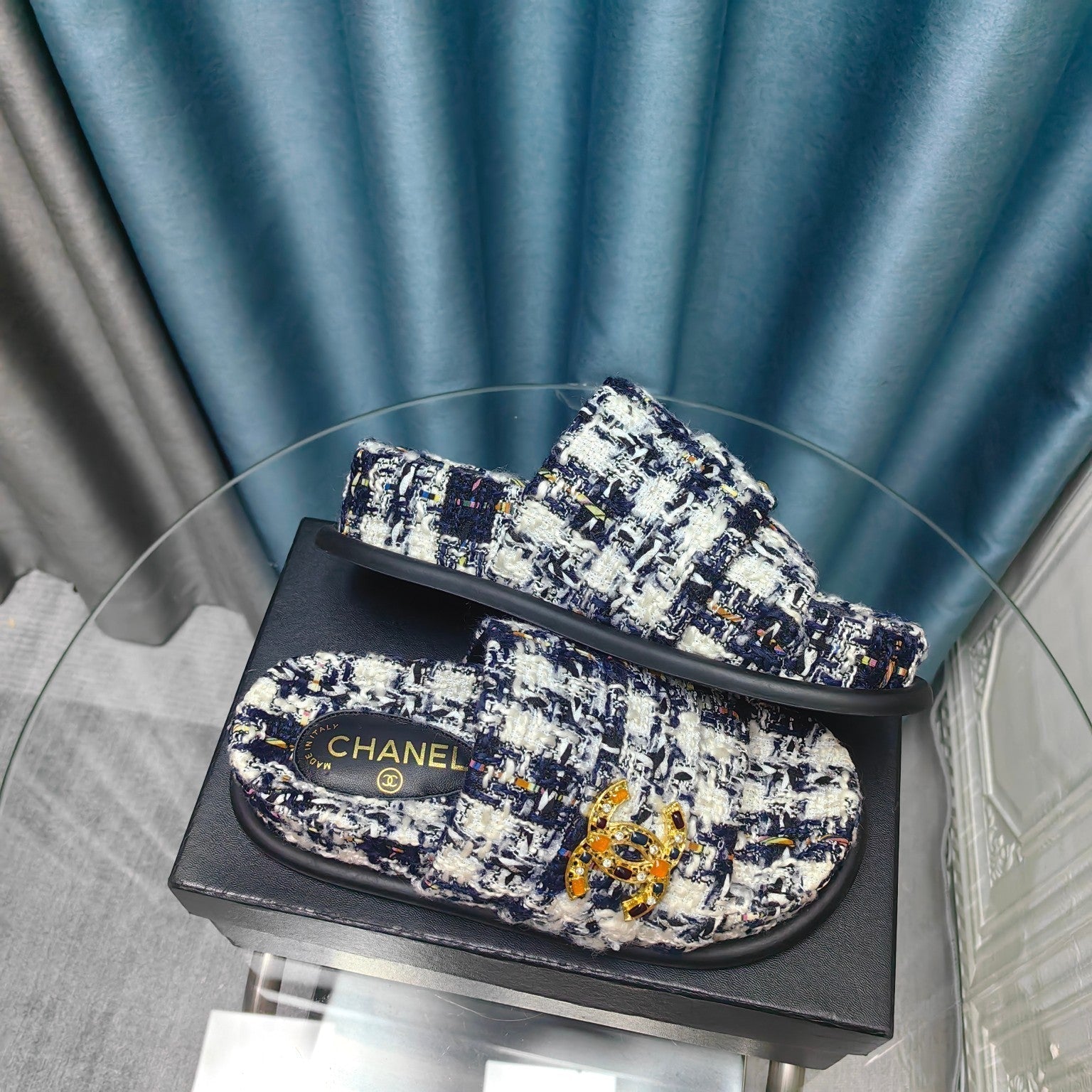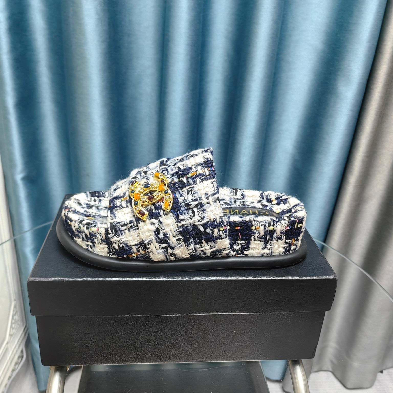 PLATFORM SLIPPERS IN BLACK TWEED AND LAMBSKIN
