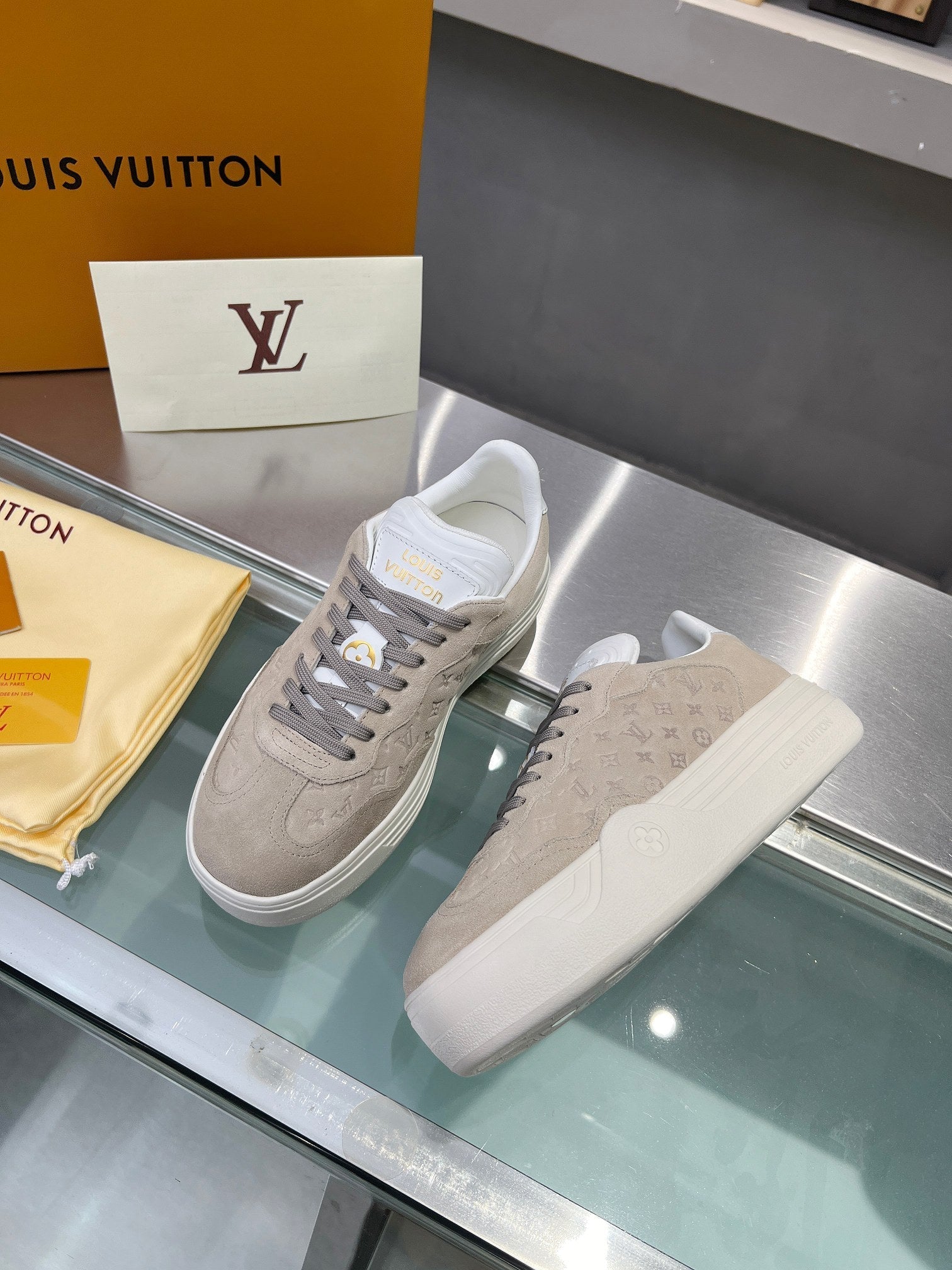 LV WOMEN GROOVY PLATFORM IN CAMEL BROWN SUEDE MIX WHITE EMBOSSED CALFSKIN