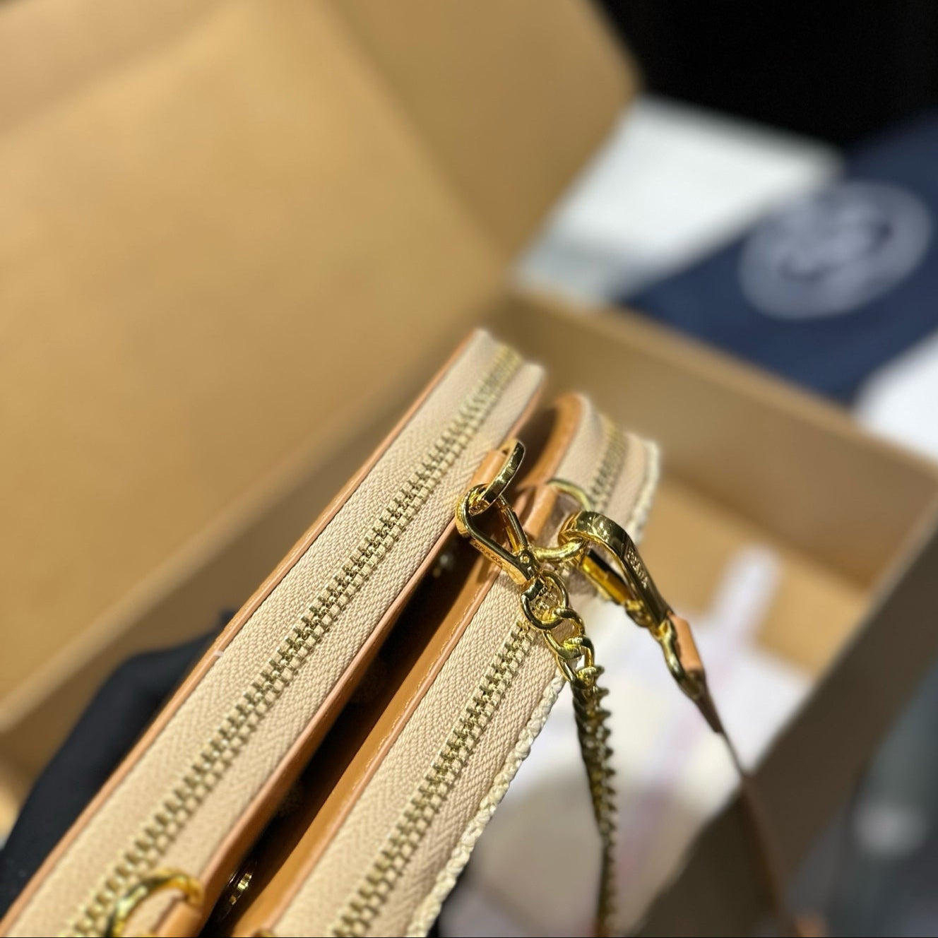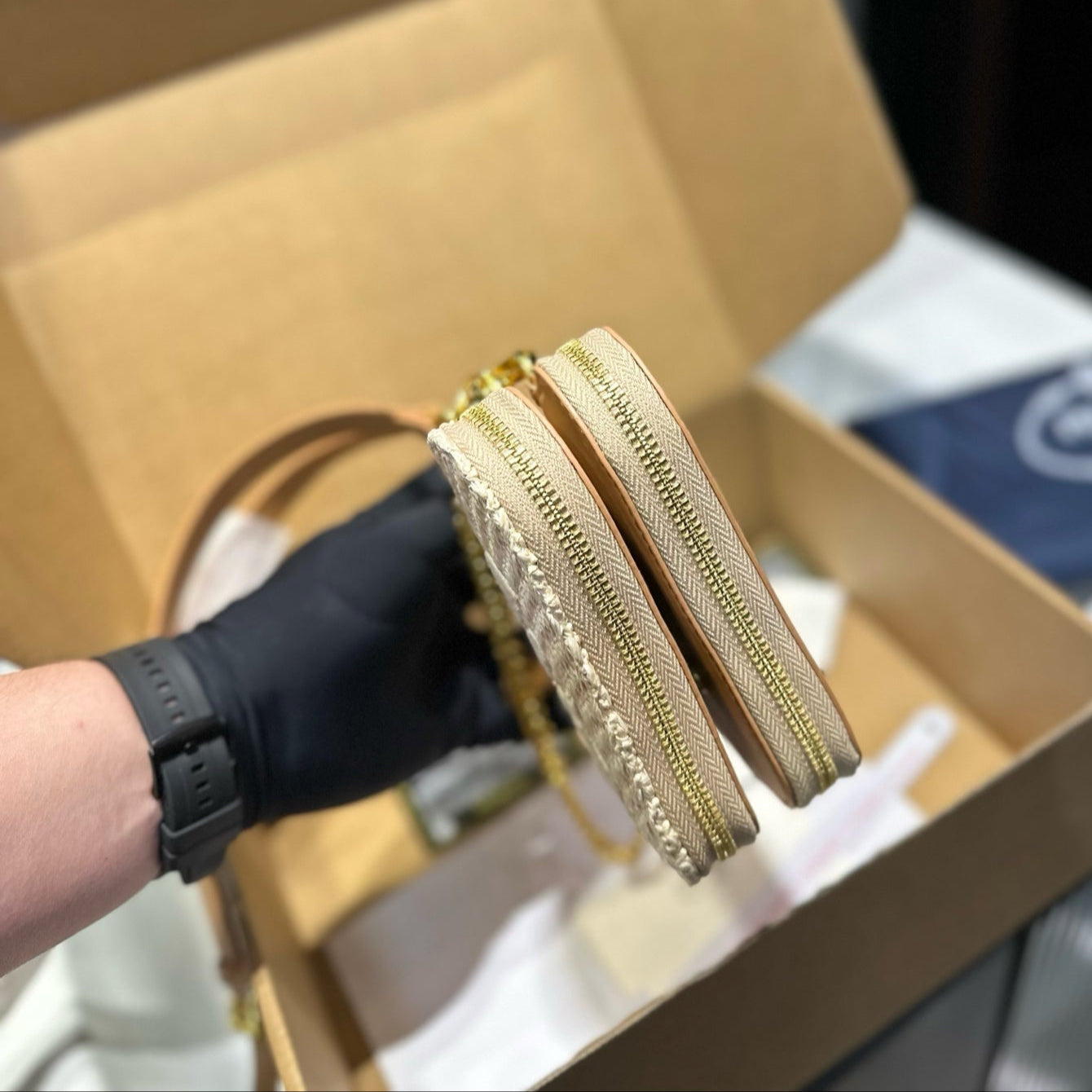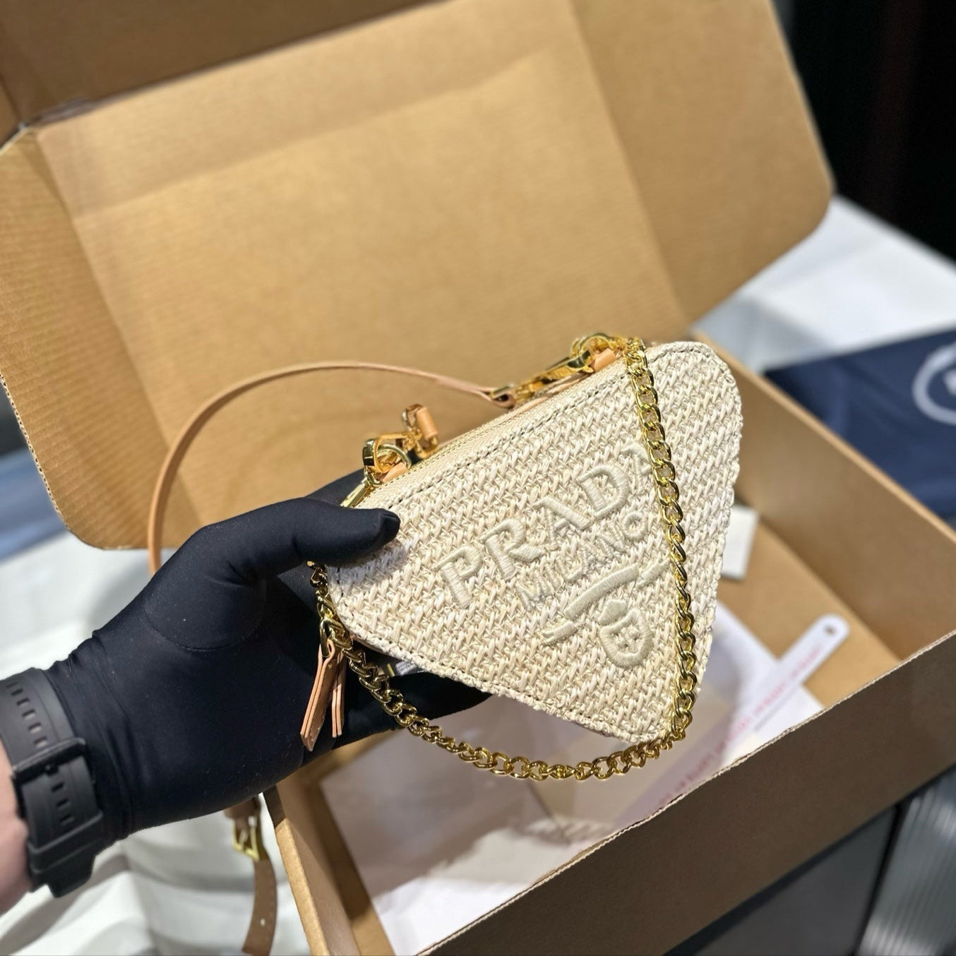 EMBROIDED LOGO TRIANGLE BAG 18 IN BEIGE WOVEN RAFFIA GOLD CHAIN