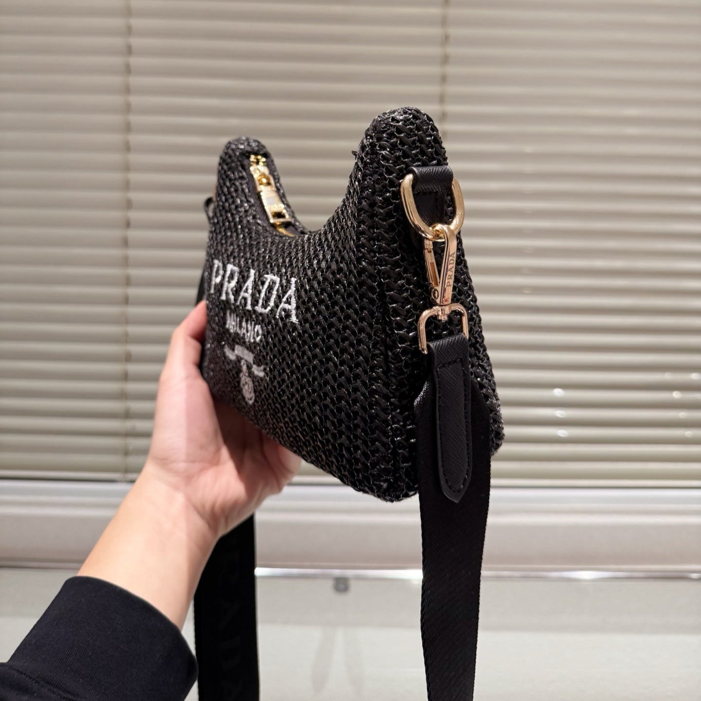 HOBO CROCHET BAG 23 IN BLACK WOVEN RAFFIA GOLD HARDWARE