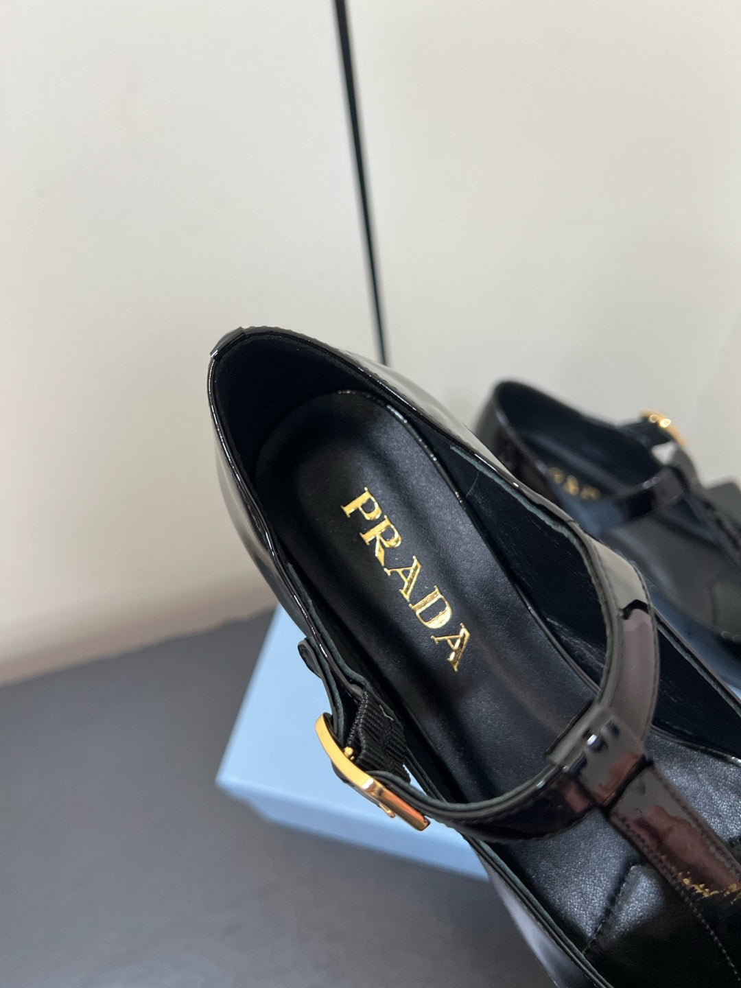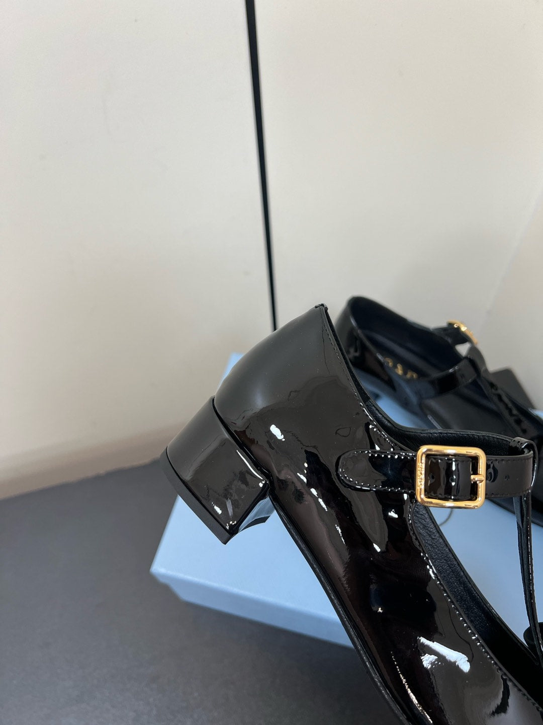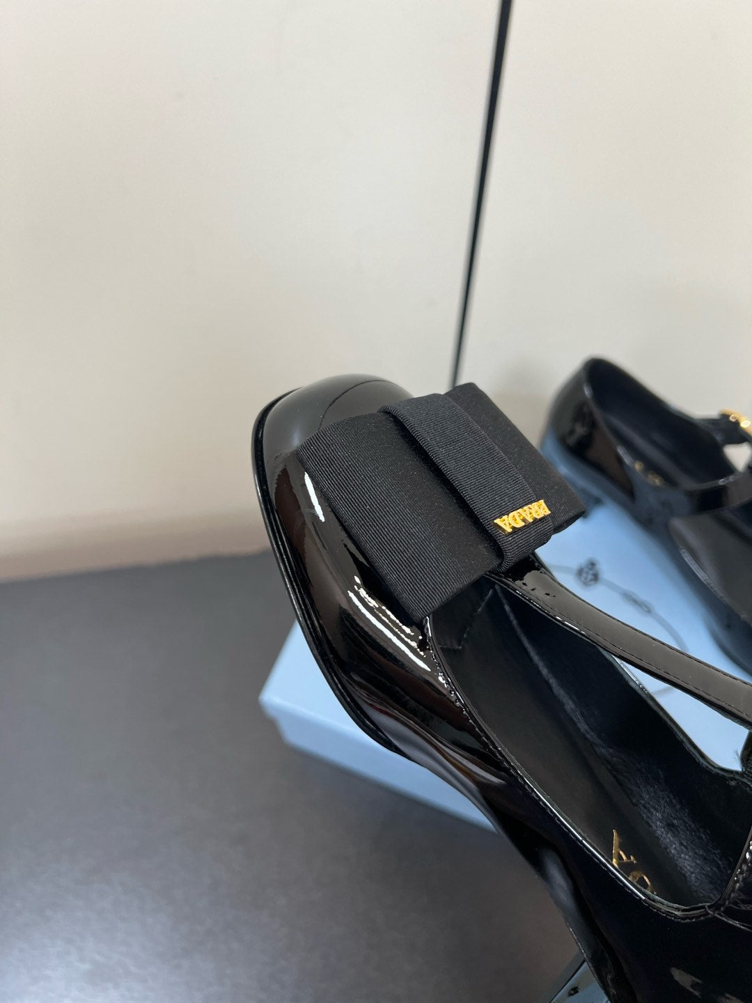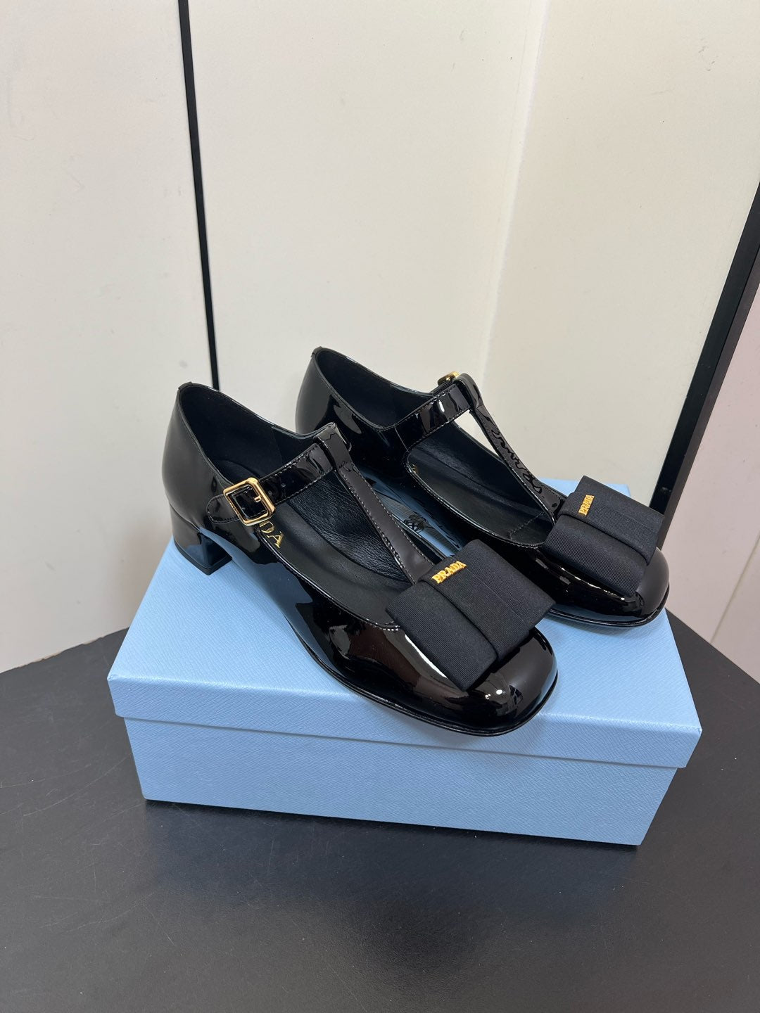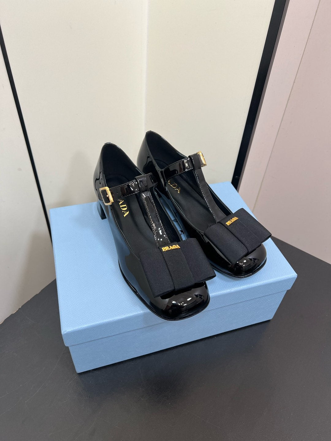 BOW MARY JANE PUMPS WITH T-STRAP IN BLACK GLOSSY CALFSKIN