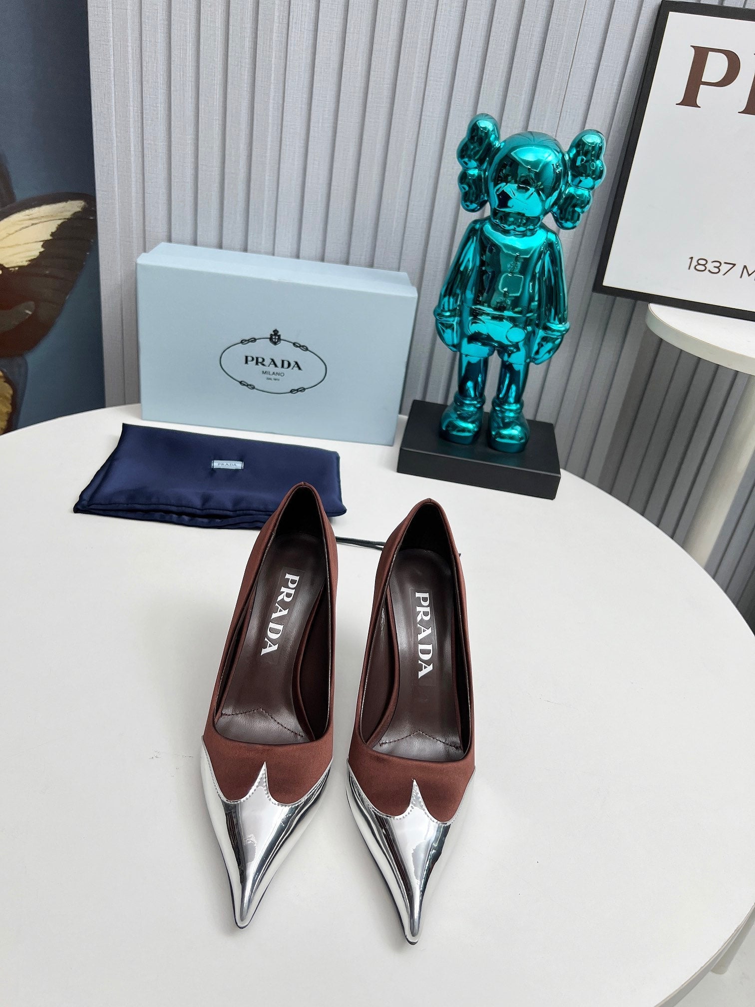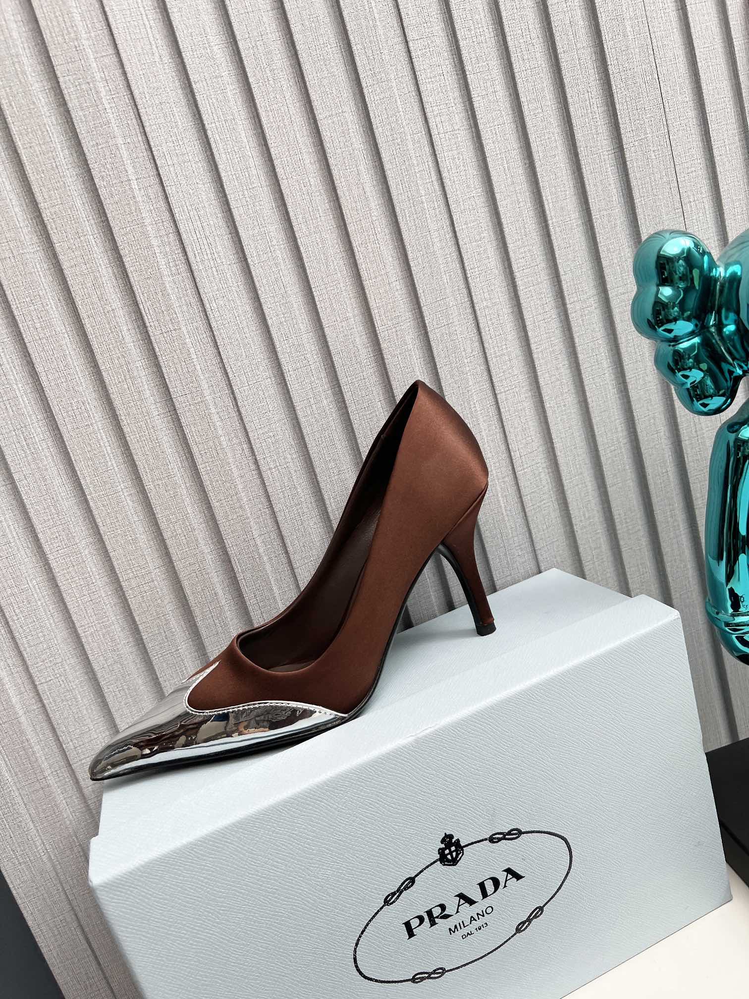 HIGH POINTED-TOE PUMPS IN CHOCOLATE MIX SILVER SATIN