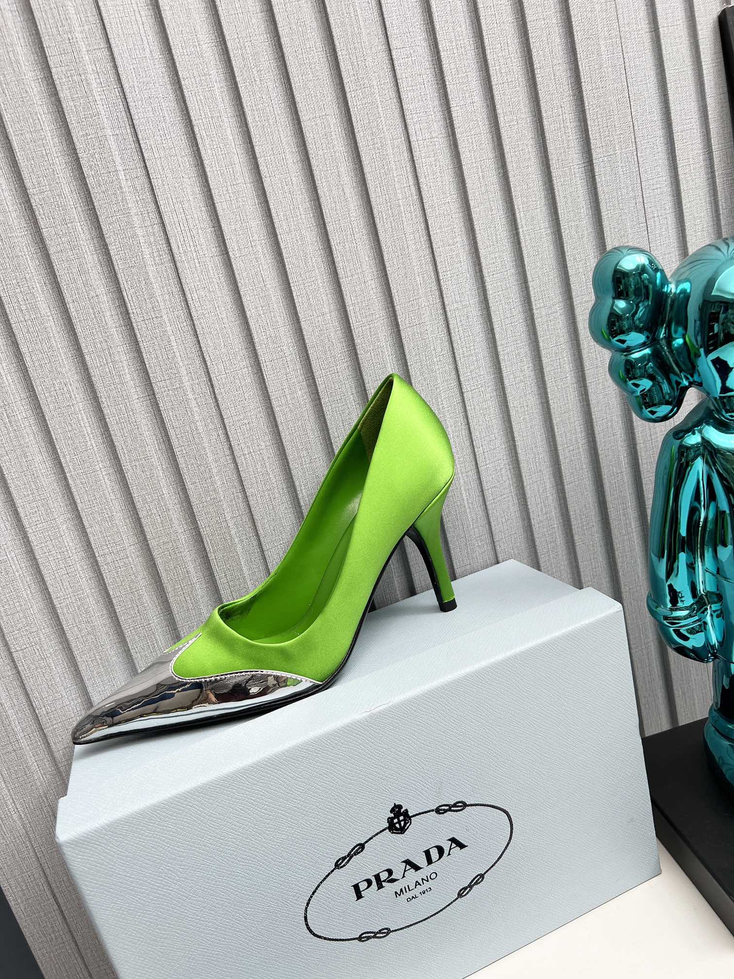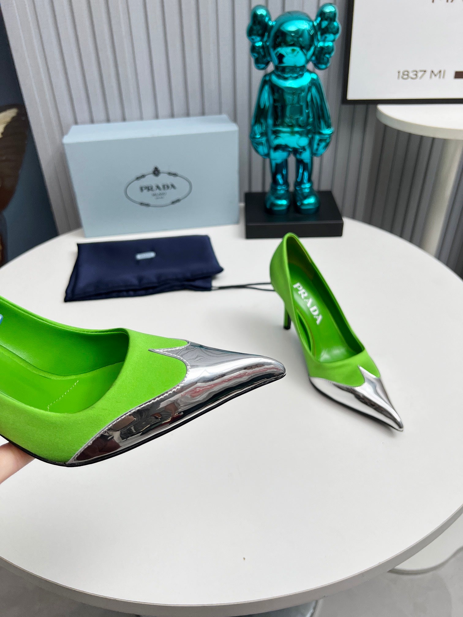 HIGH POINTED-TOE PUMPS IN LIME GREEN MIX SILVER SATIN