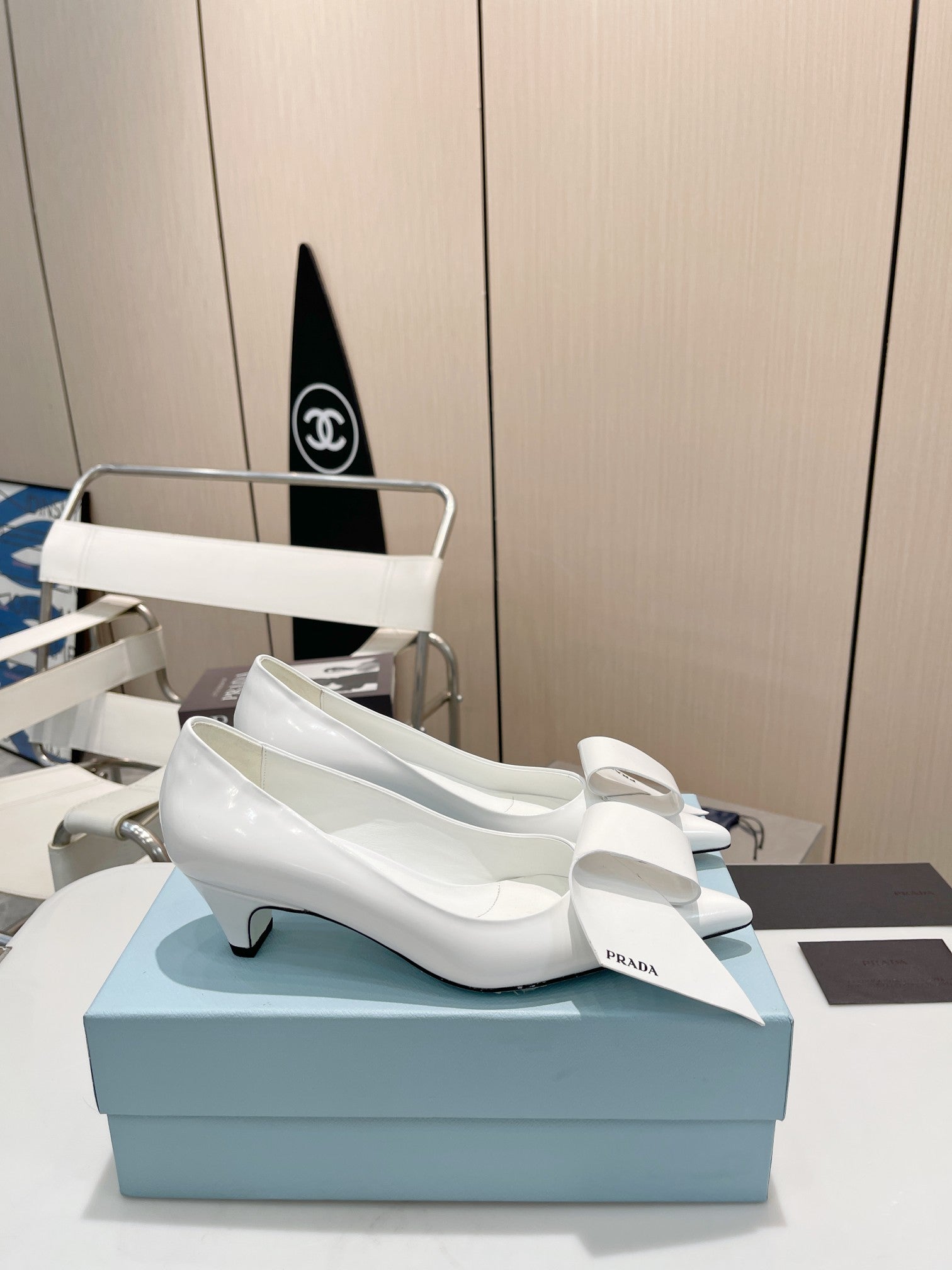 POINTED TOE PUMPS KITTEN HEEL IN WHITE GLOSSY LAMBSKIN WITH BOW