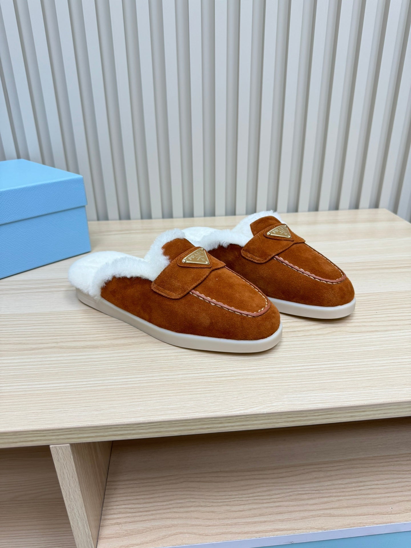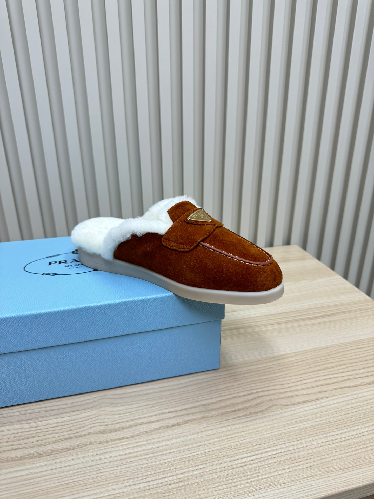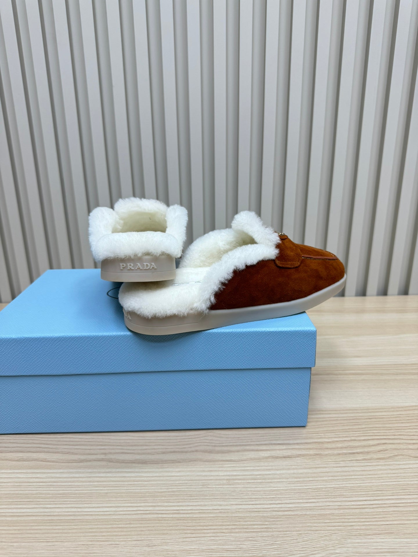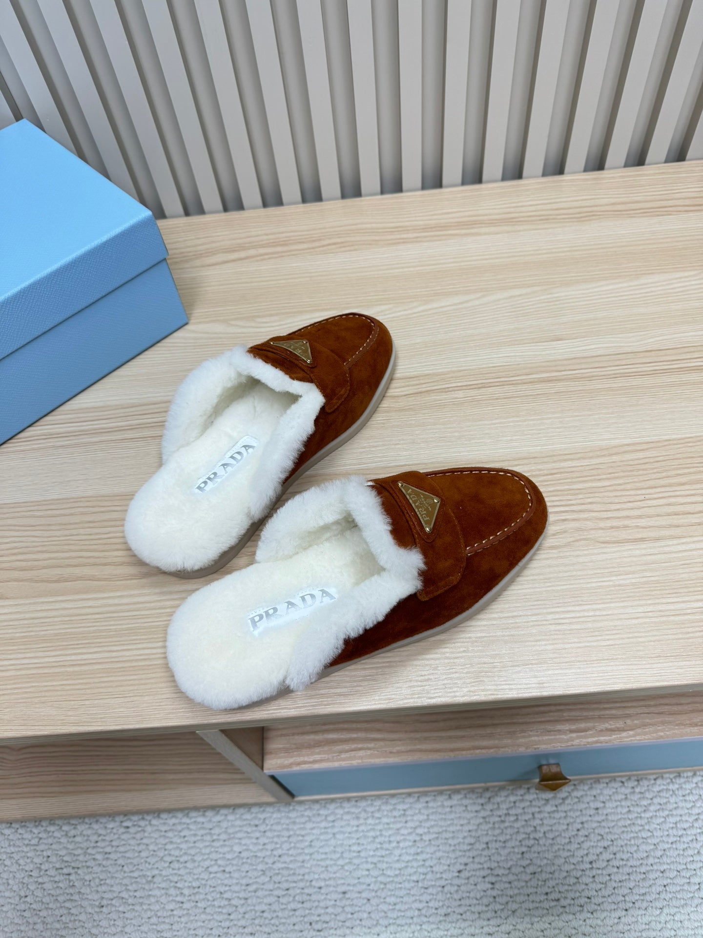 TRIANGLE LOGO FLATS IN RED BROWN SUEDE AND FUR LINING
