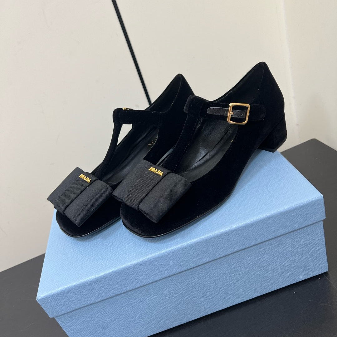 BOW MARY JANE PUMPS WITH T-STRAP IN BLACK VELVET