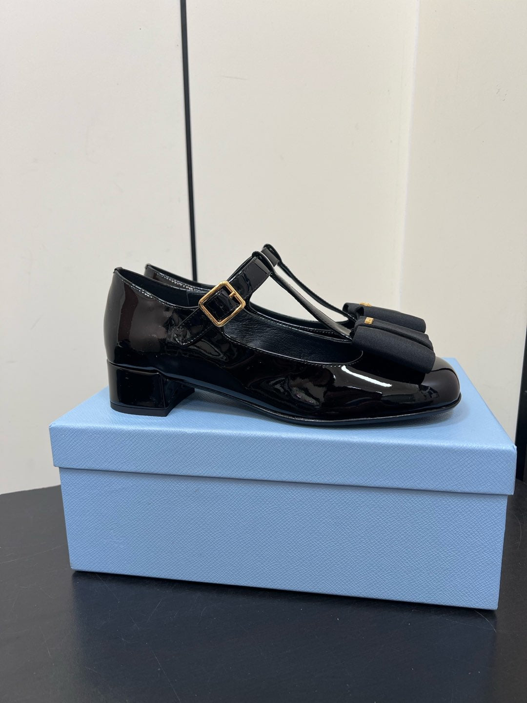 BOW MARY JANE PUMPS WITH T-STRAP IN BLACK GLOSSY CALFSKIN