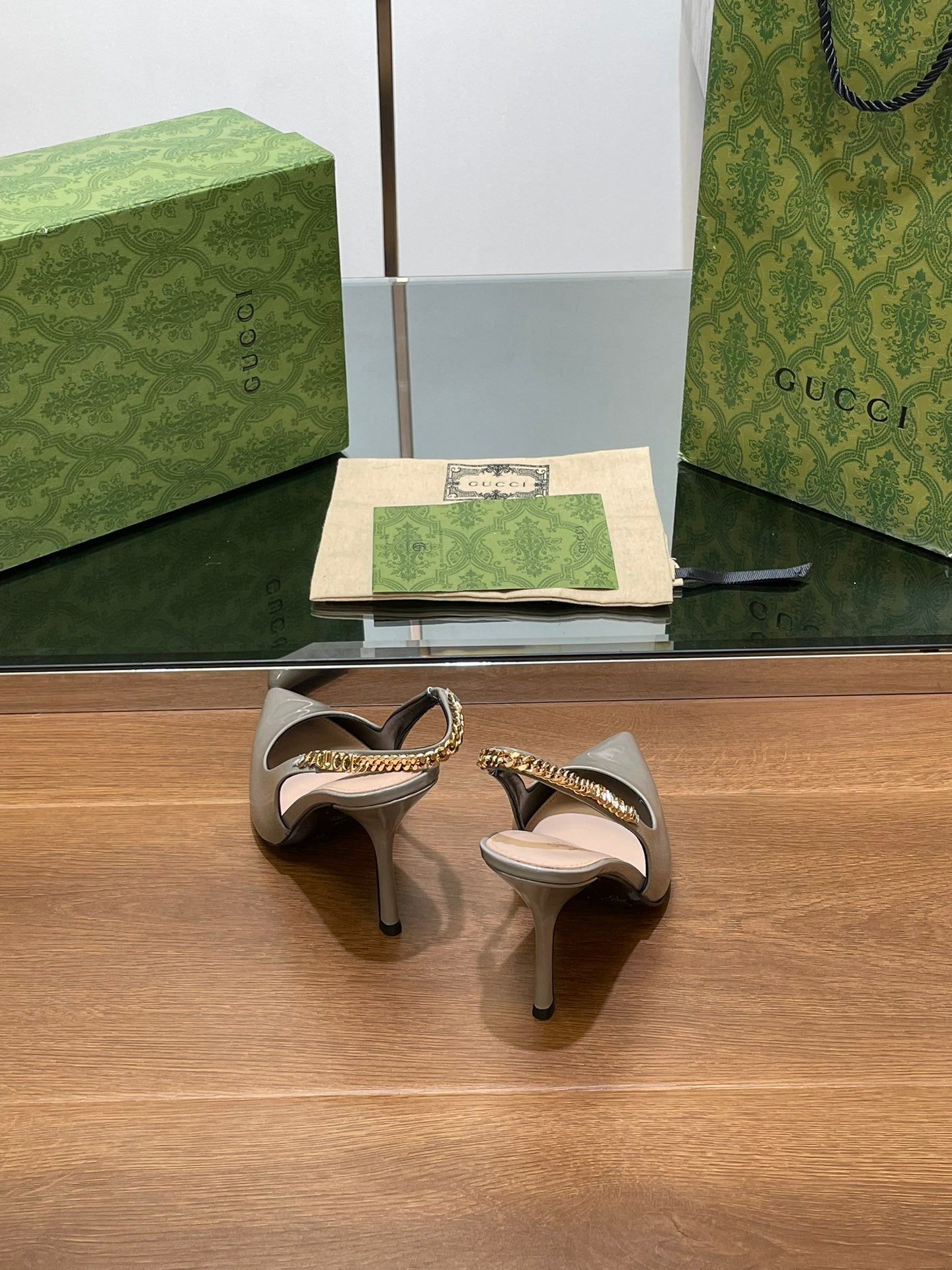 • GG HIGH SLINGBACK 10.5 CM IN DOVE GREY GLOSSY CALFSKIN WITH GOLD HARDWARE
