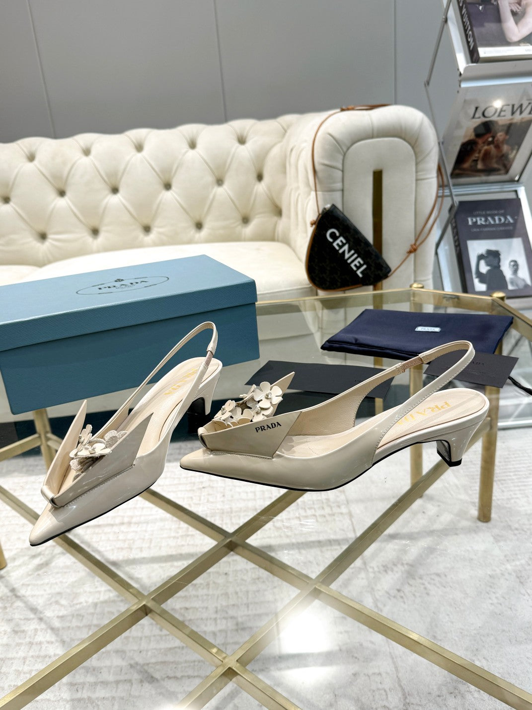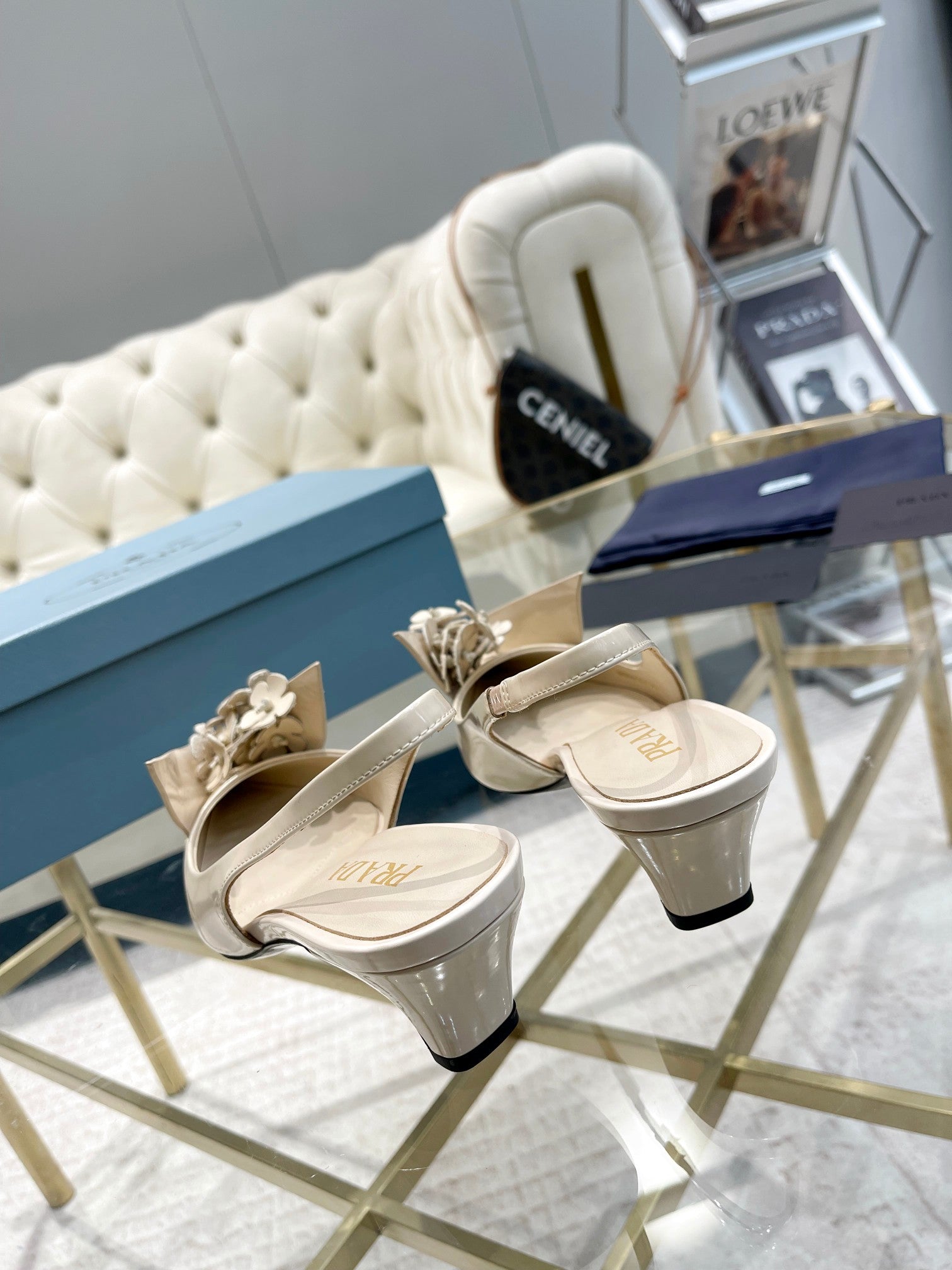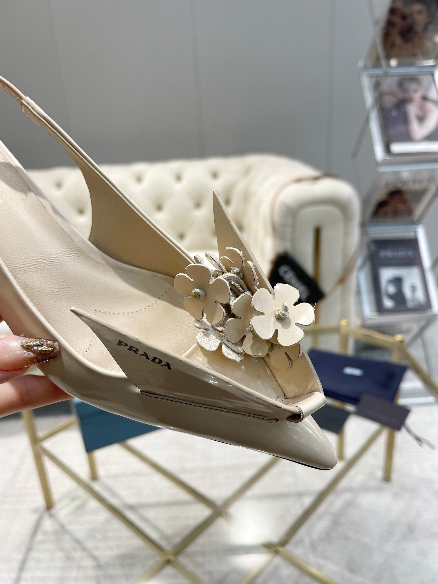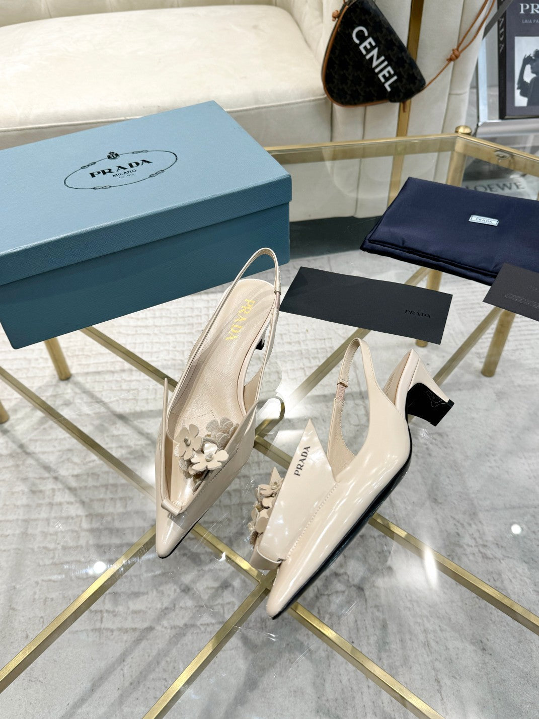 • MEDIUM HEEL SLINGBACK ATTACHED CREATIVE FLOWERS IN BEIGE PATENT CALFSKIN