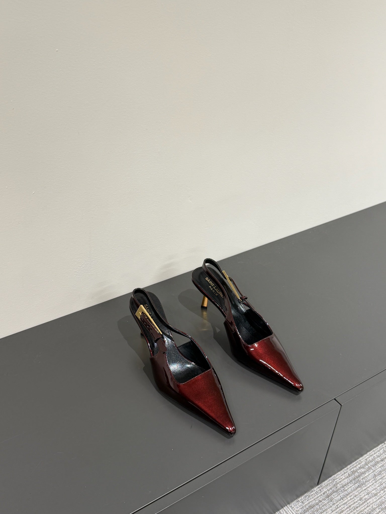 LEE SLINGBACK PUMPS 105 IN MAROON PATENT LEATHER GOLD HEEL