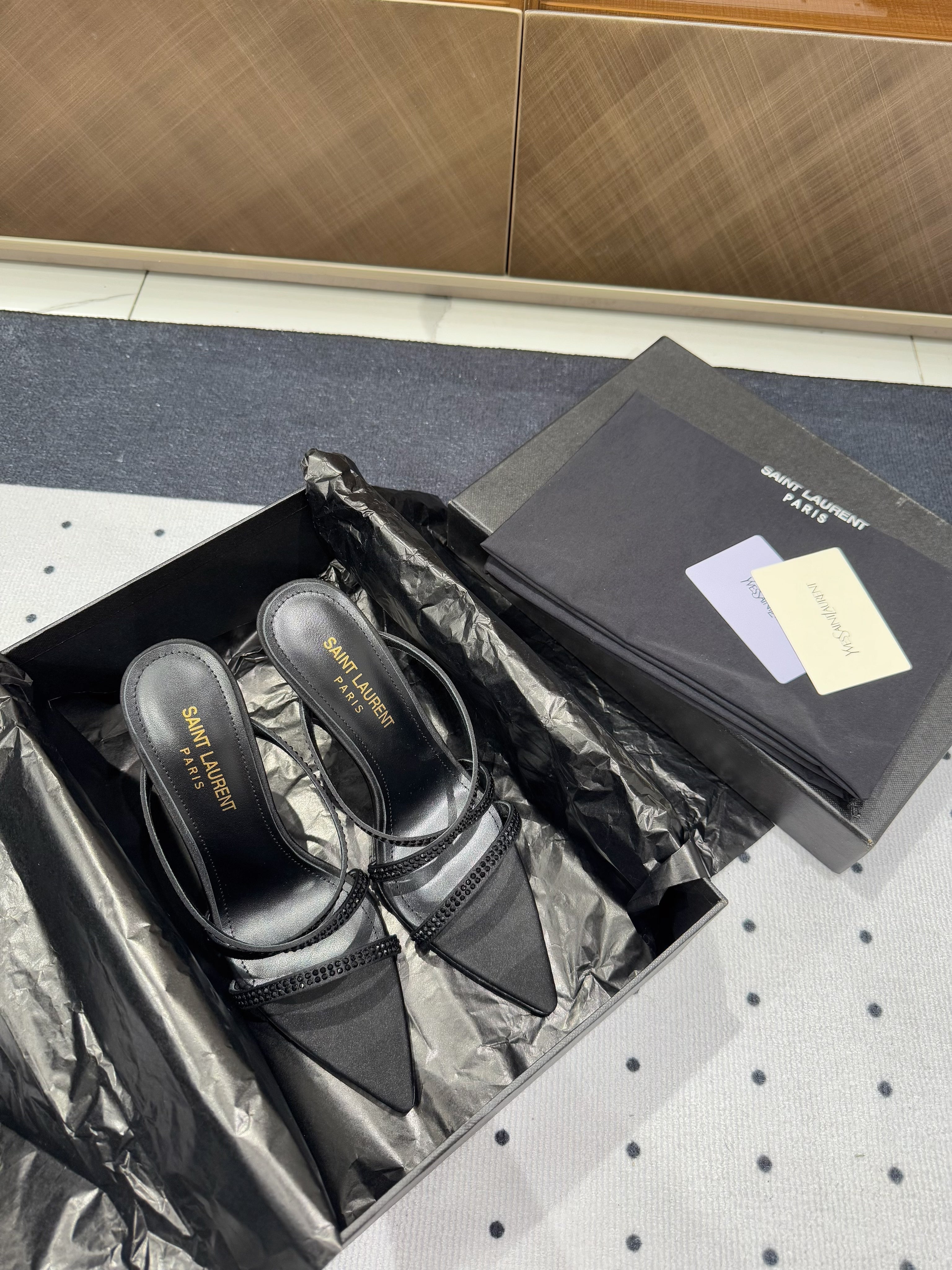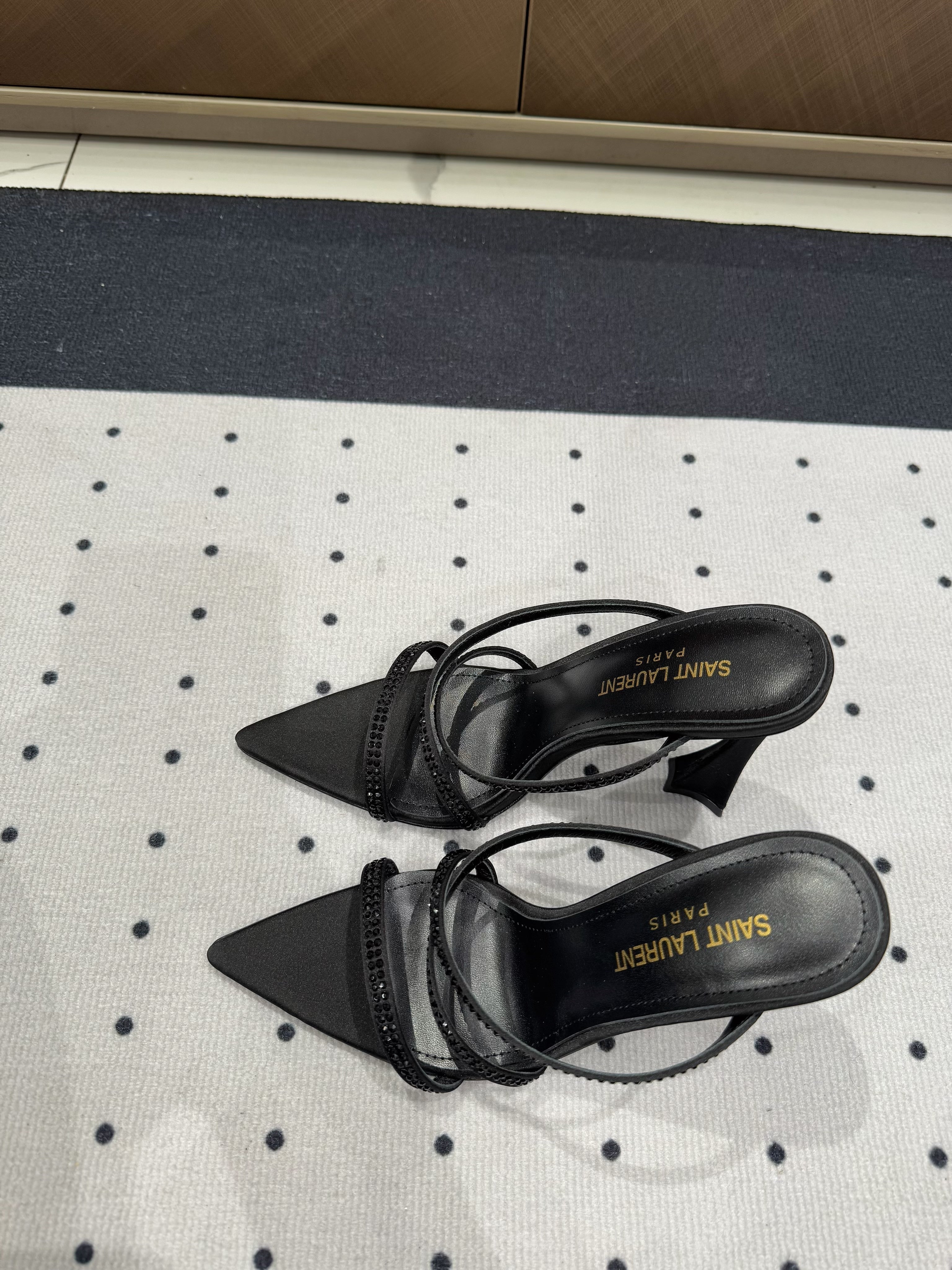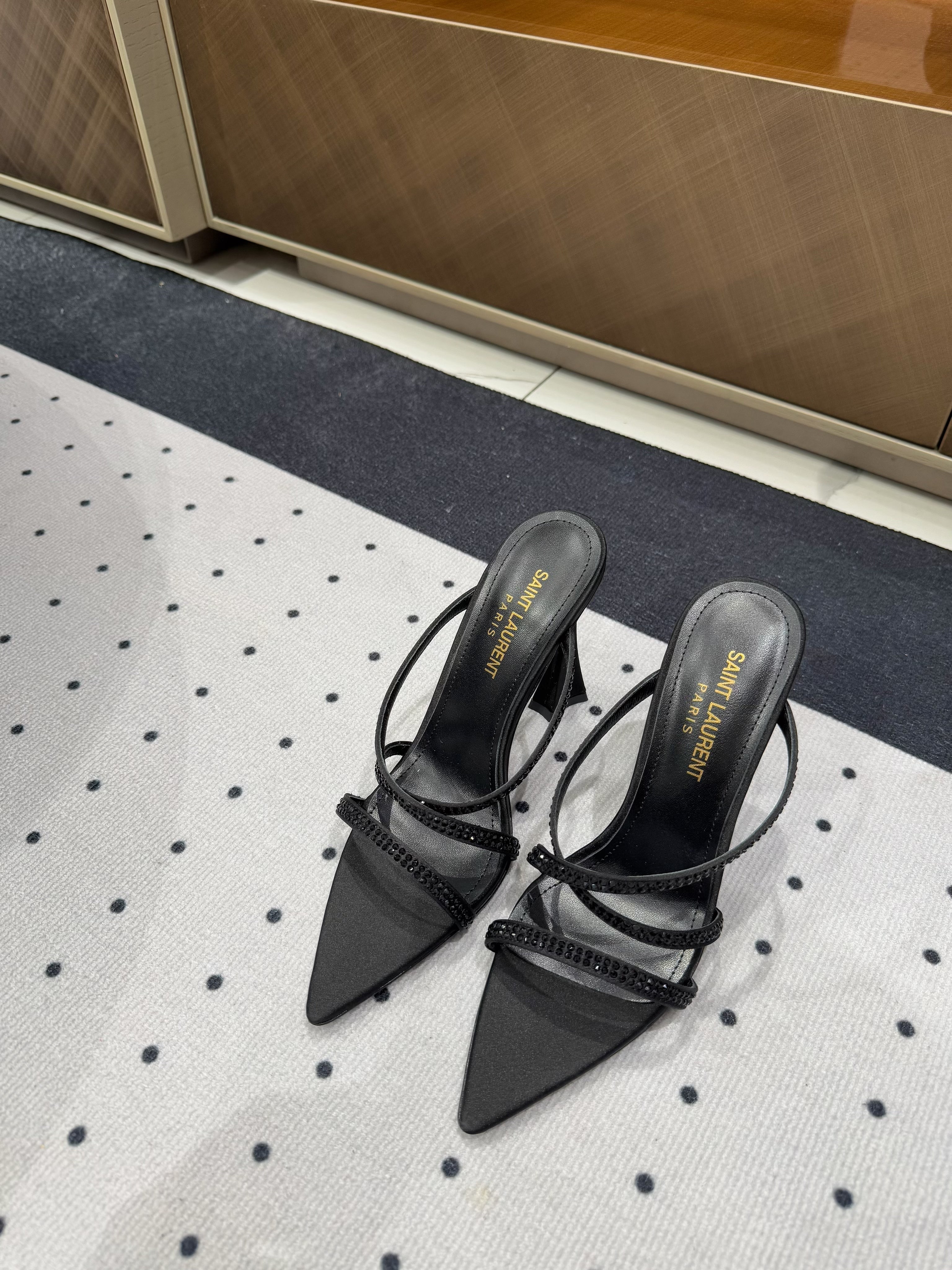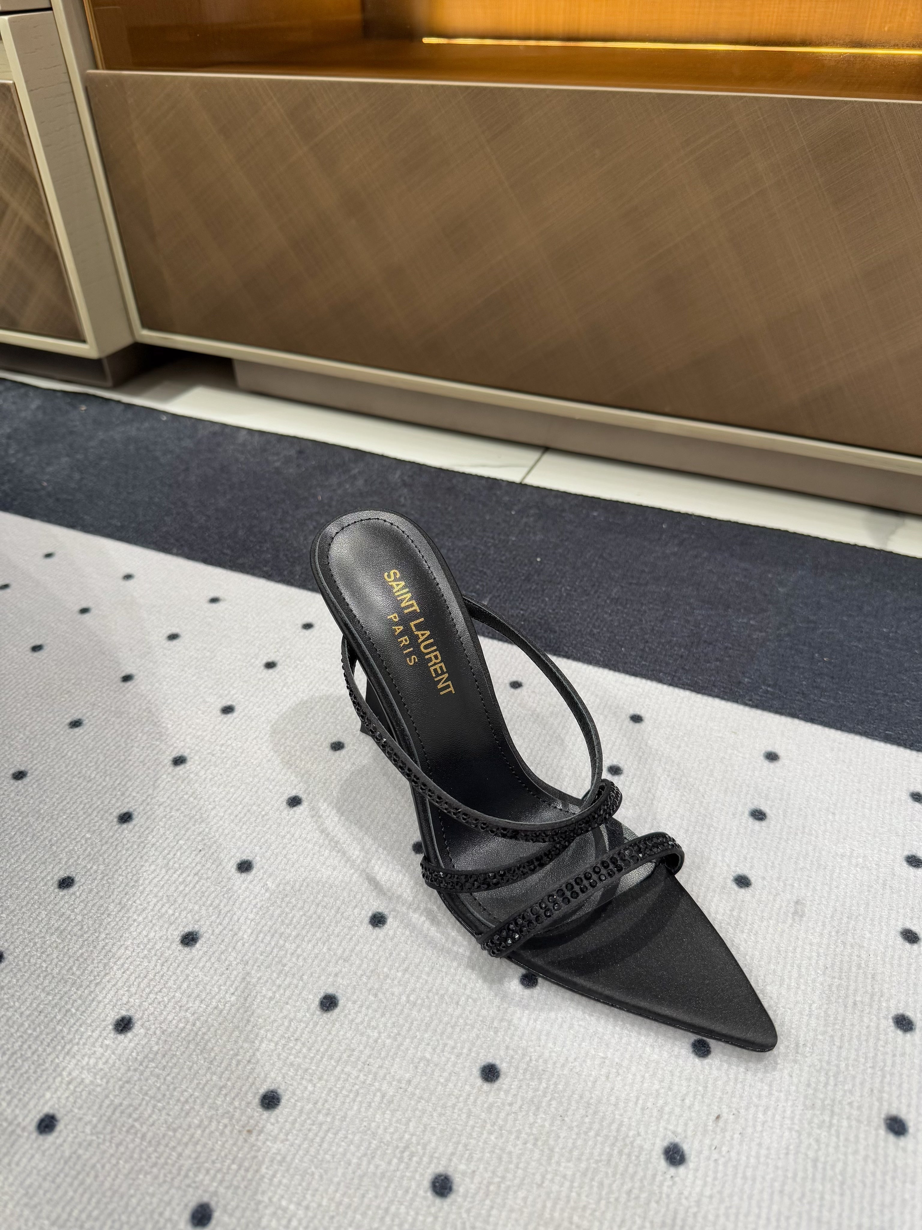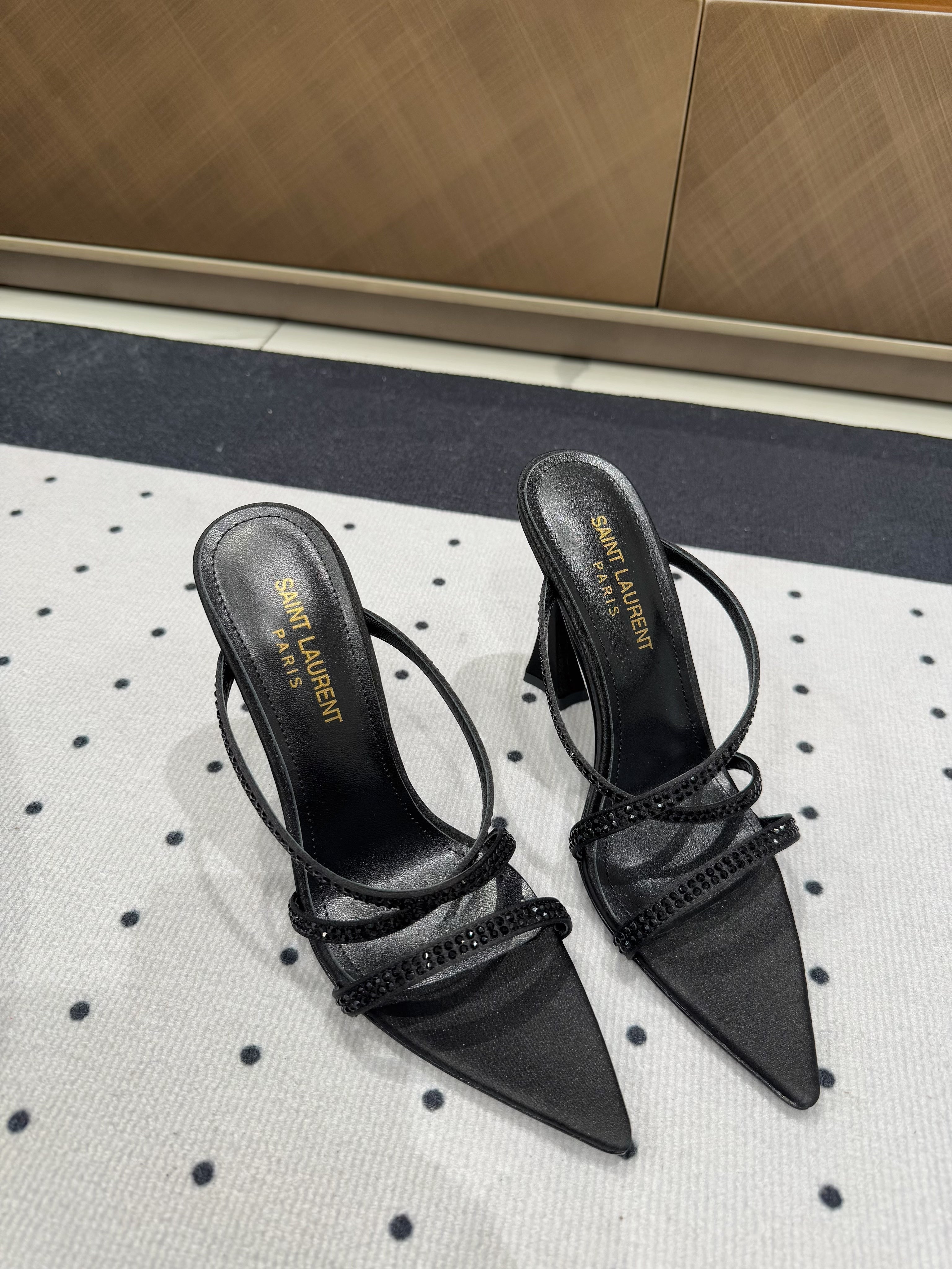 HIGH CRYSTAL STRAP SANDALS IN BLACK SILK