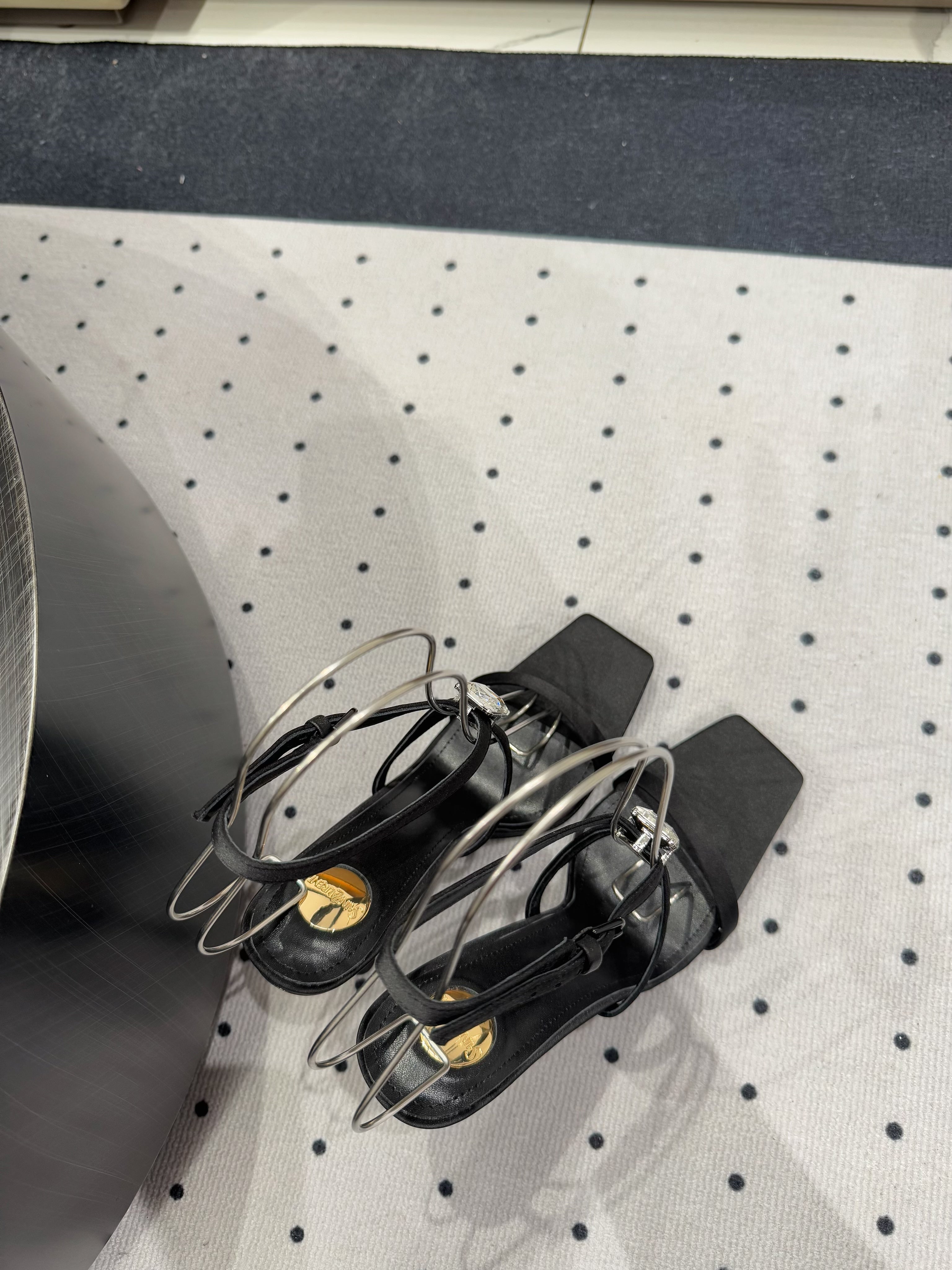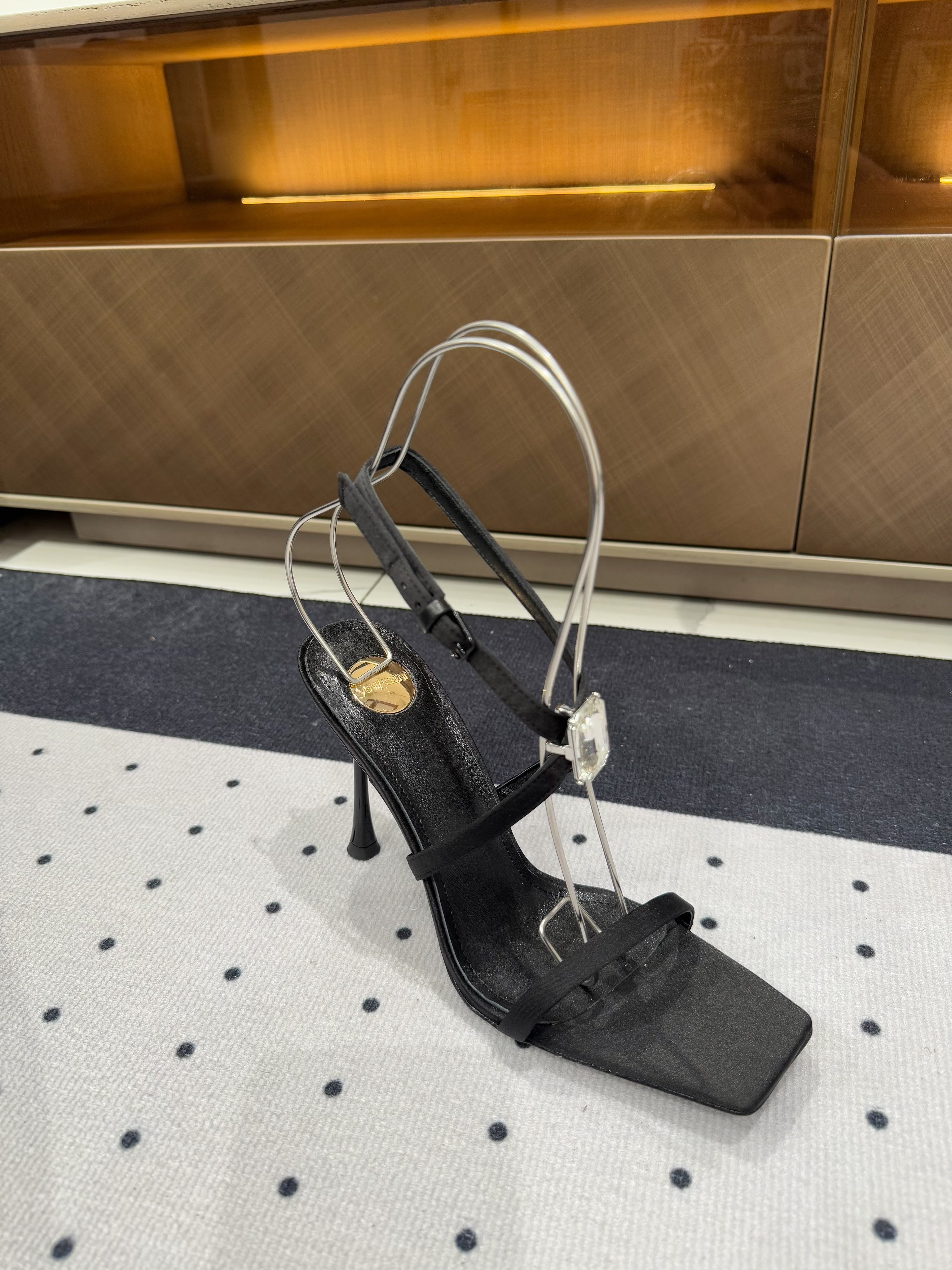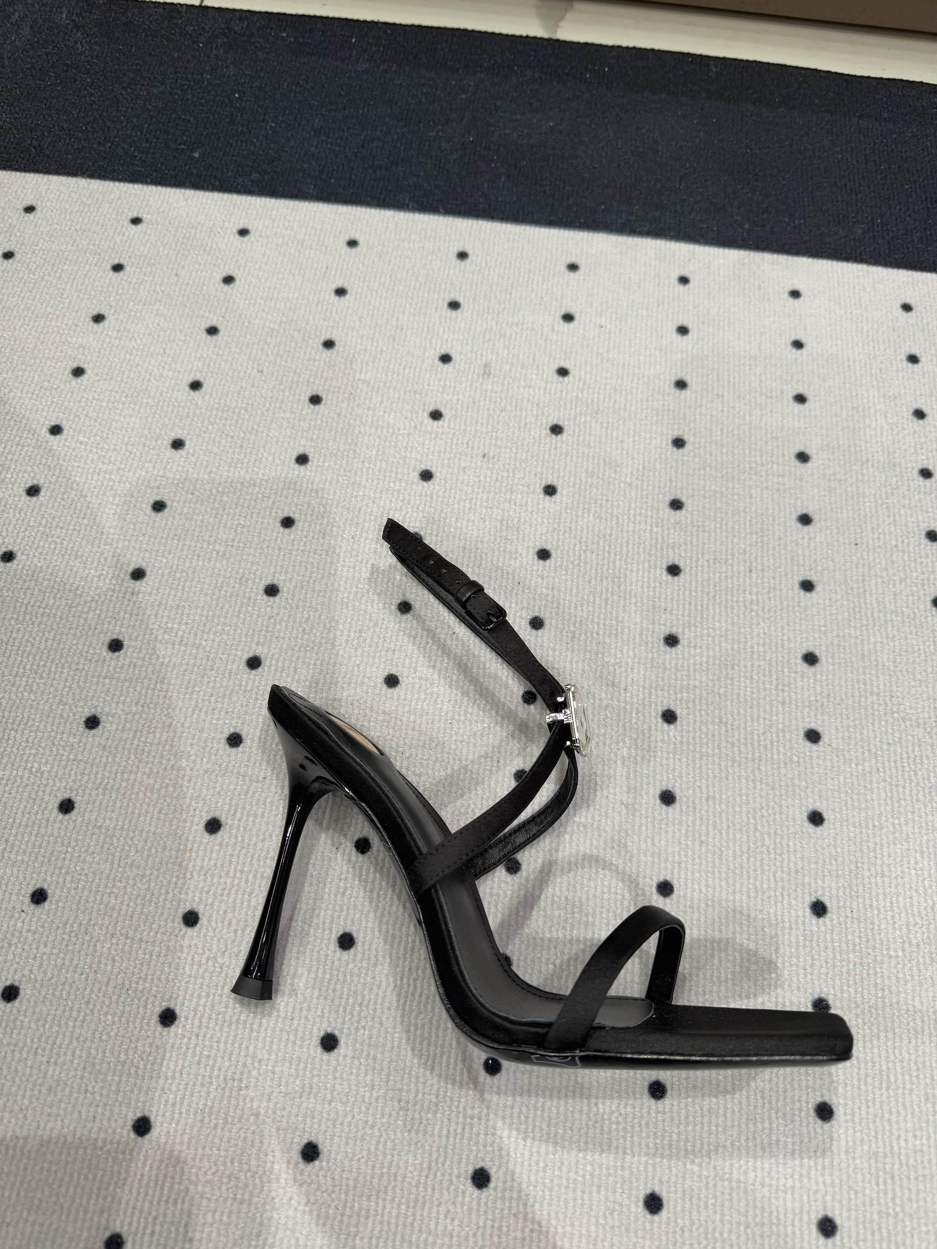 HIGH HEEL SANDALS IN BLACK SILK WTH STRAPS ATTACHED GEM