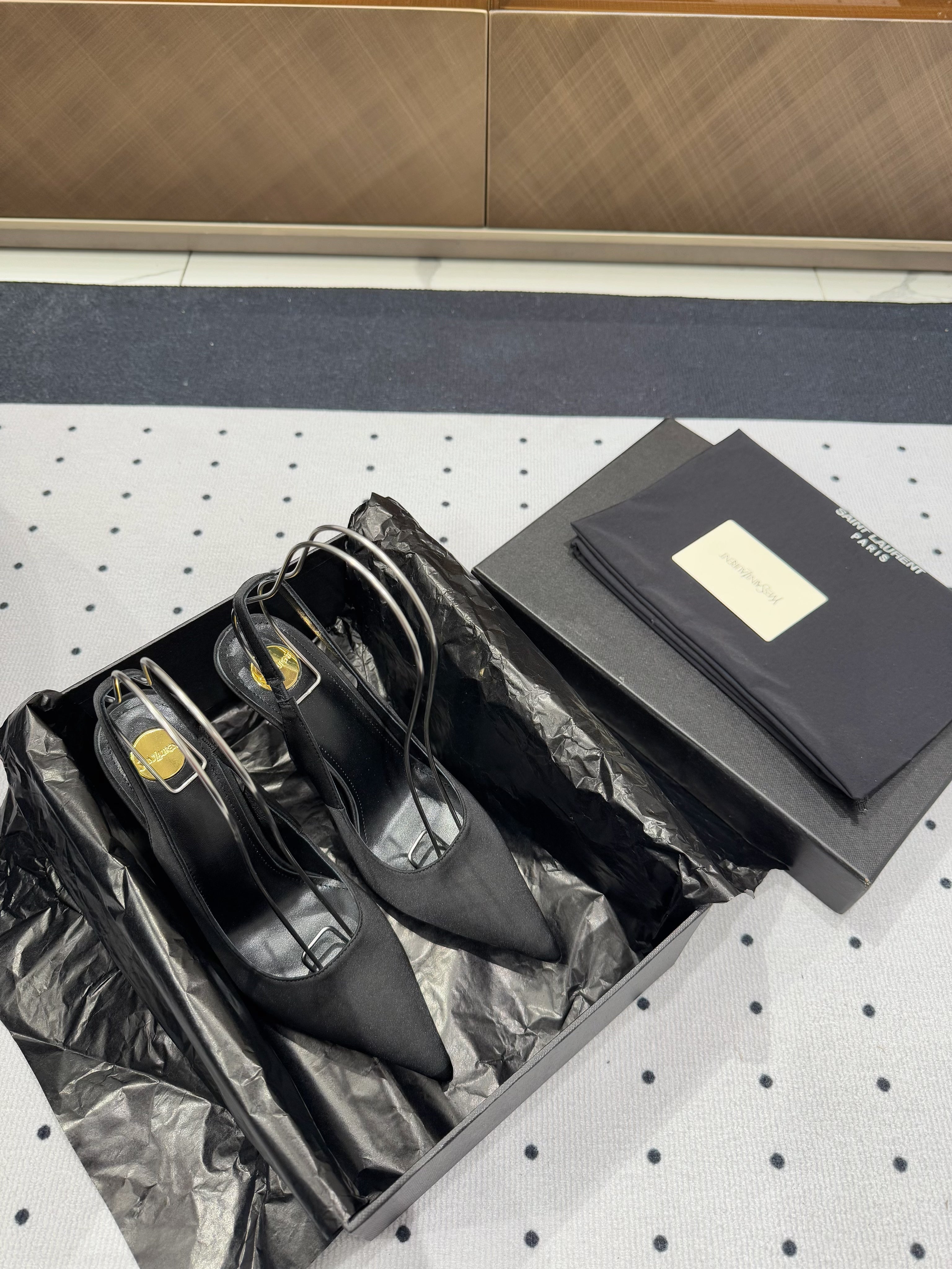 L'ENTRACTE SLINGBACK PUMPS IN BLACK SATIN