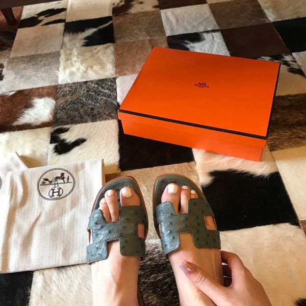 HERM Oran Slide Sandals In Vert Amande Ostrich Leather