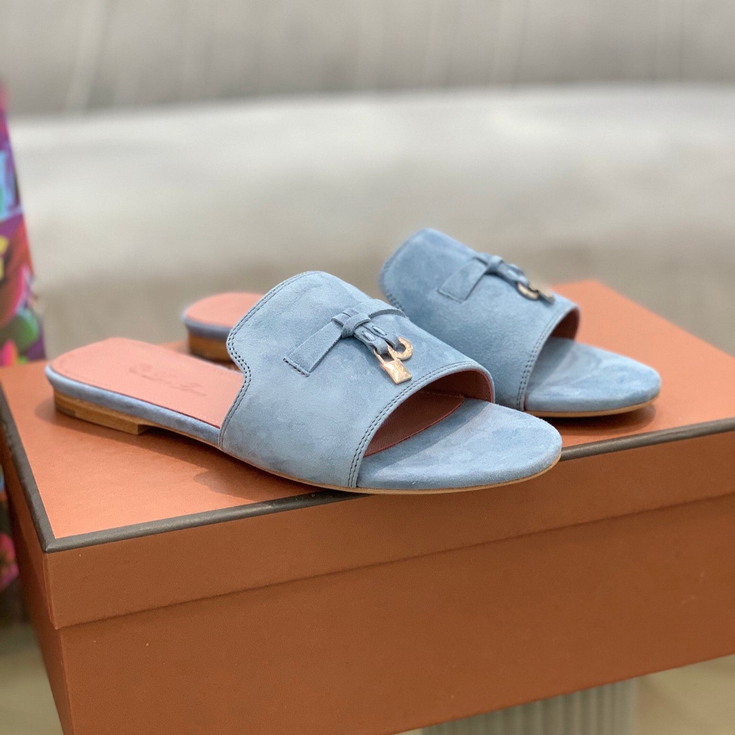 • Summer Charms Sandals in Sky Blue Suede Pink Lambskin