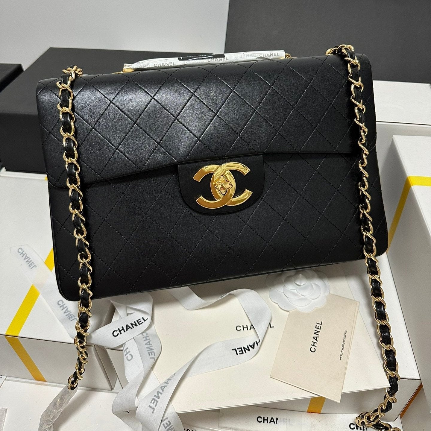 CC MAXI FLAP BAG 34 IN BLACK CALFSKIN