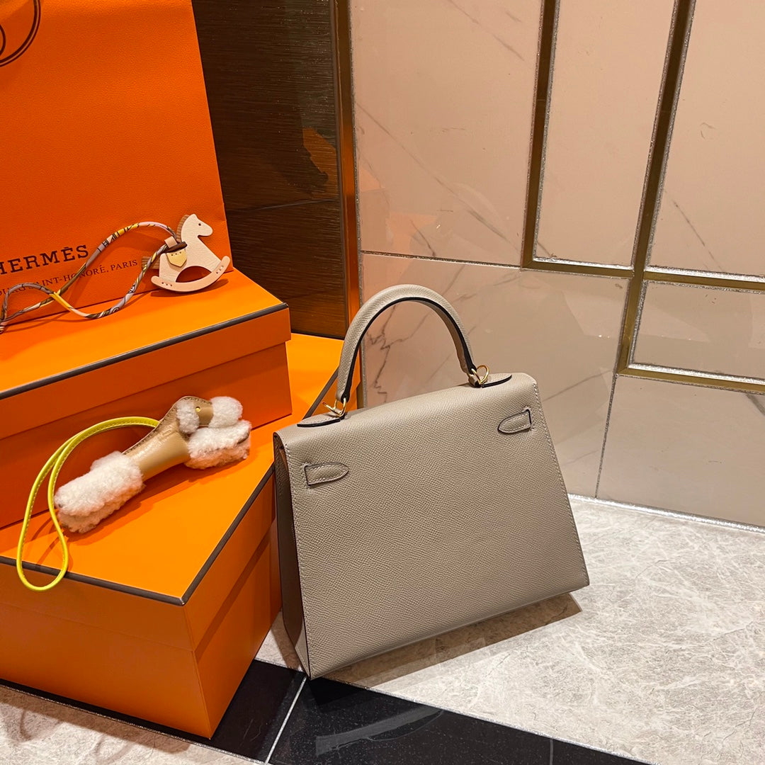 HM KELLY 25CM GREY EPSOM LEATHER GOLD HARDWARE