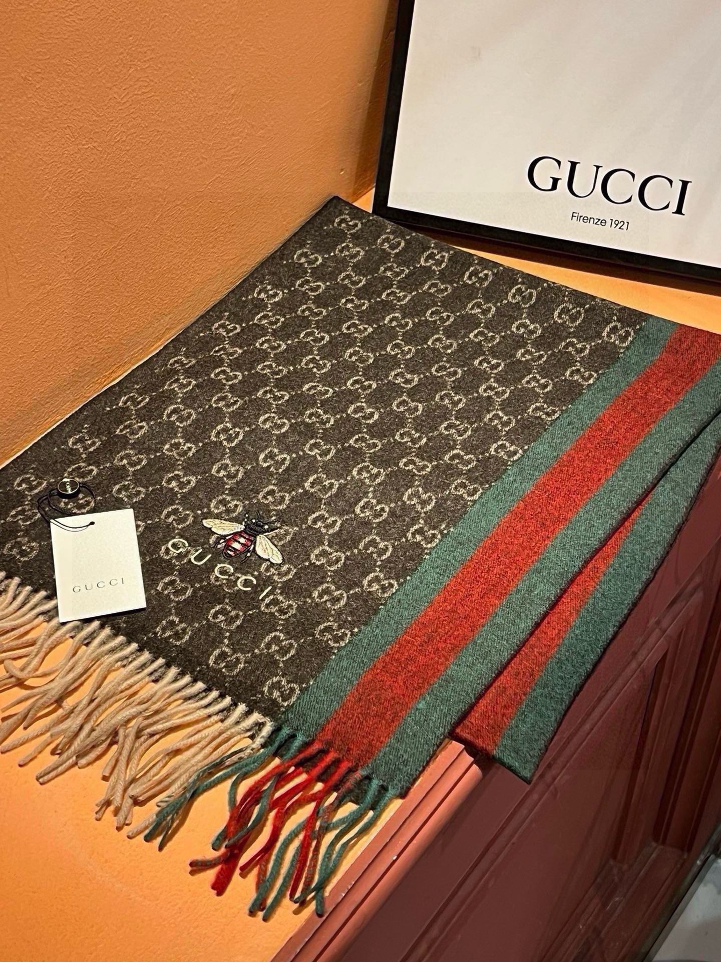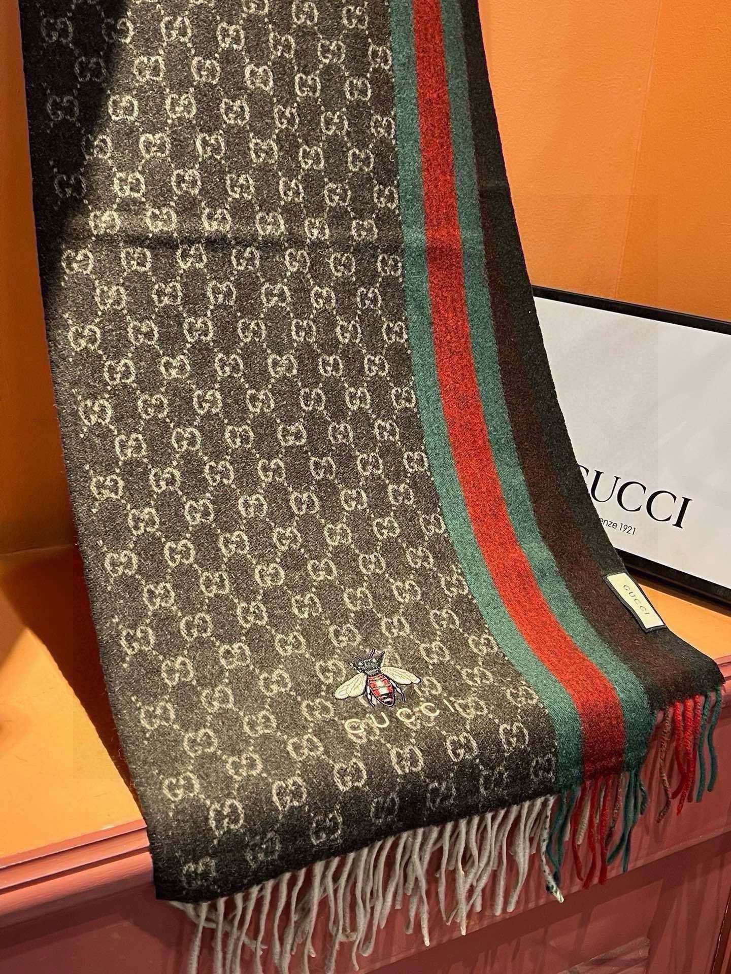 SCARF 180 CM IN CAROB BROWN CASHMERE WITH BEE PATTERN 396475