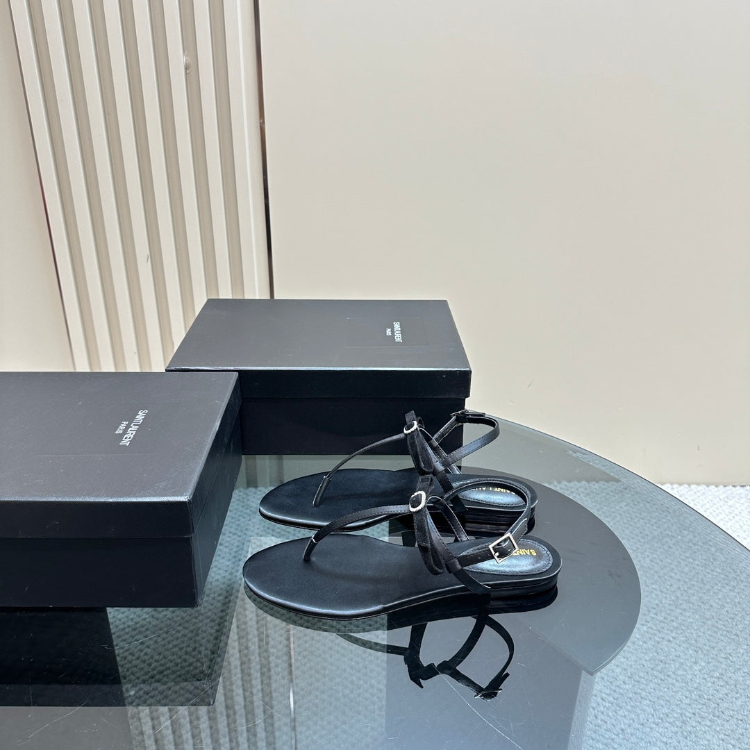 • SL CRYSTAL T-STRAP FLAT SANDAL BLACK SATIN