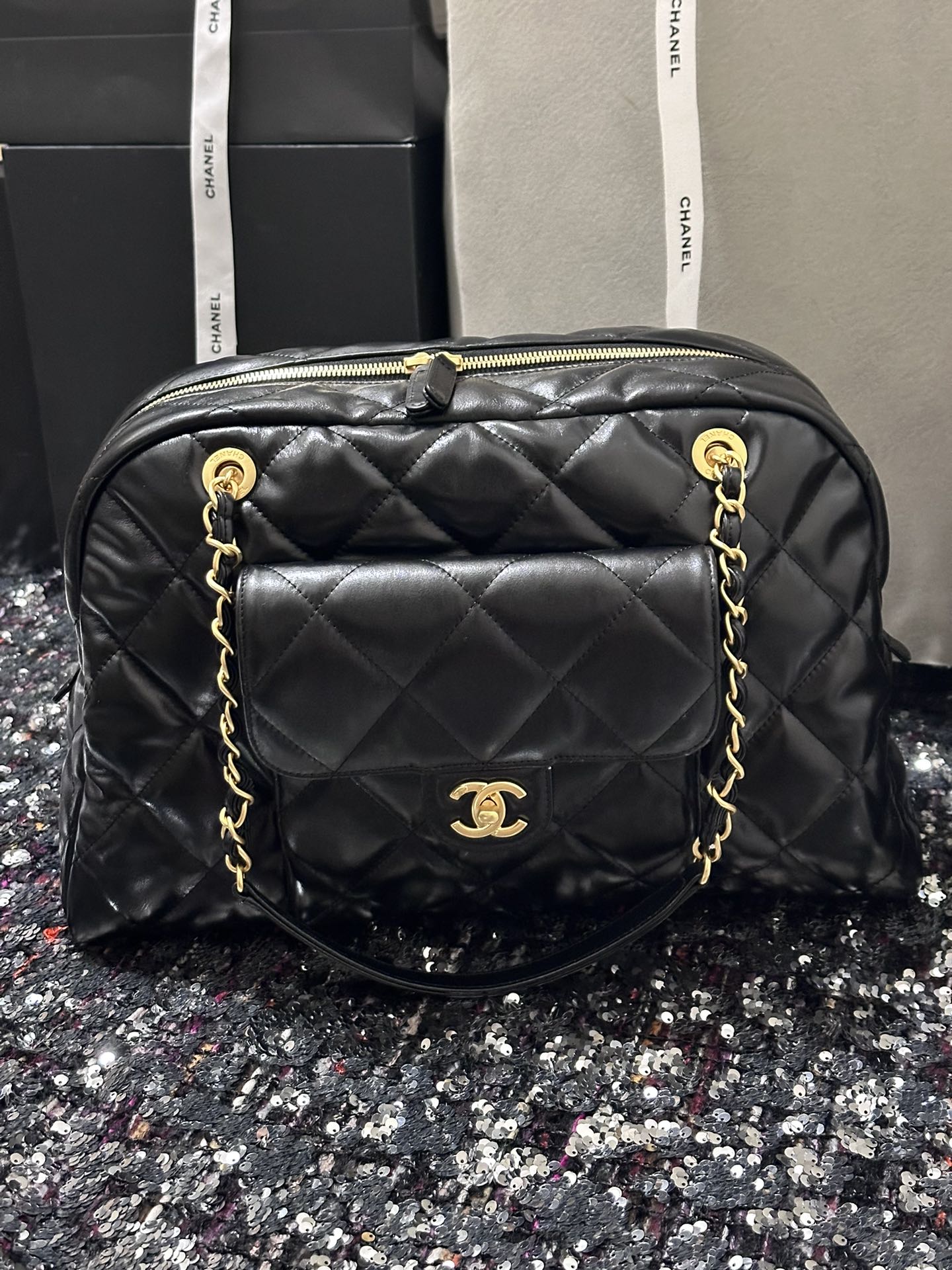 BOWLING BAG 44 IN BLACK SOFT LAMBSKIN GOLD HARDWARE