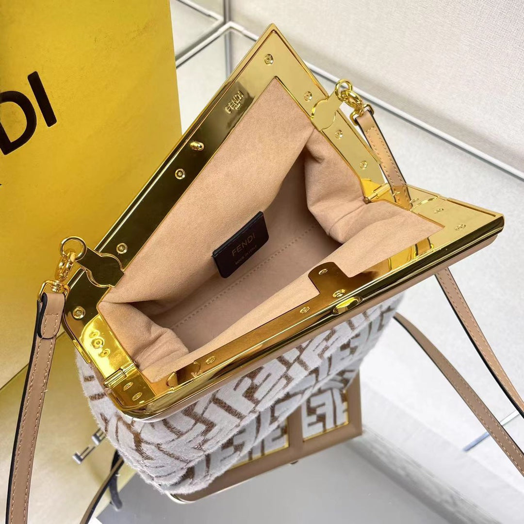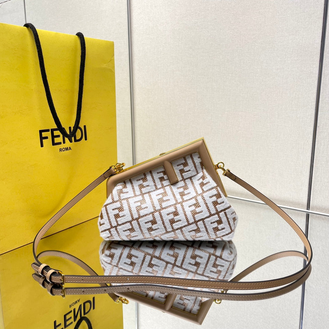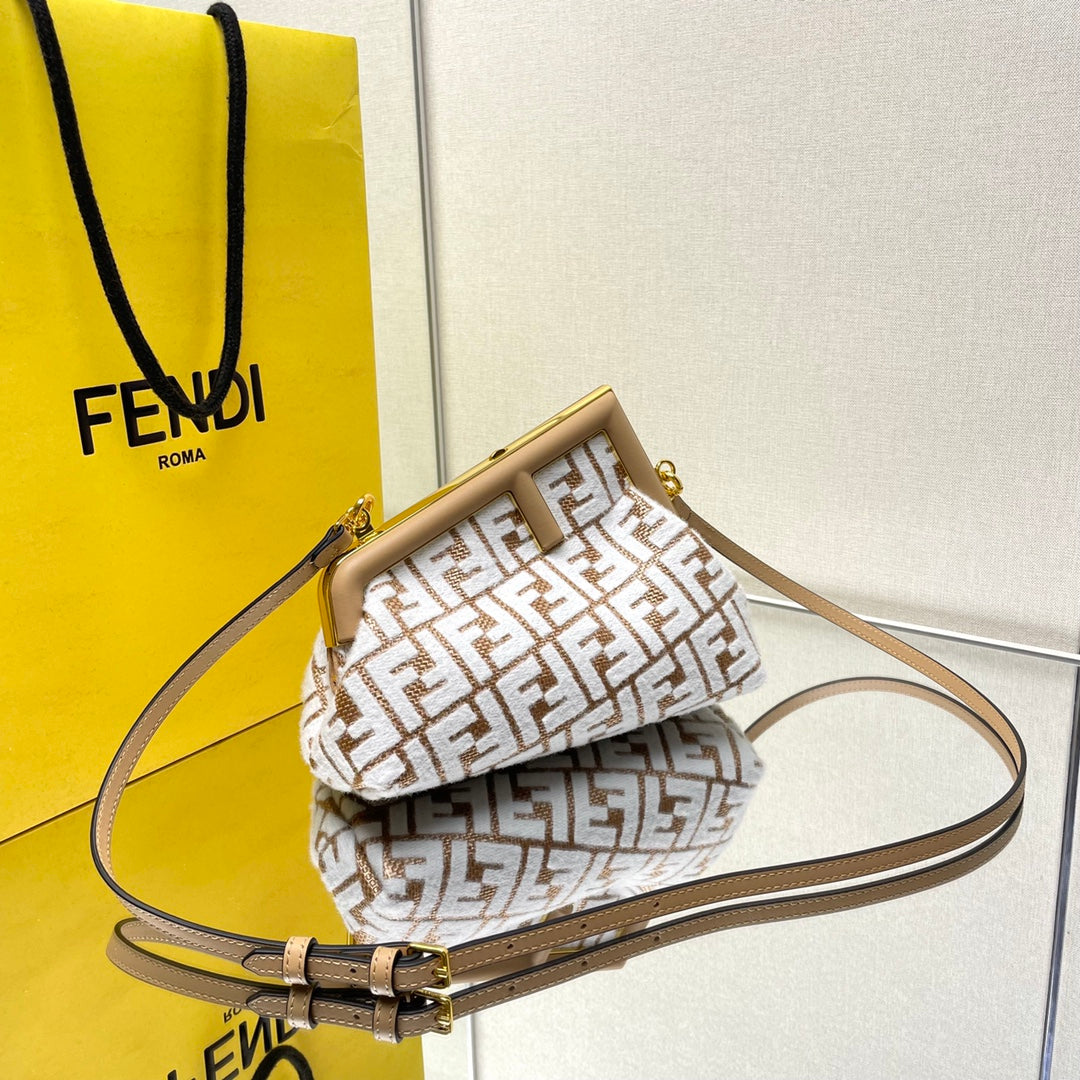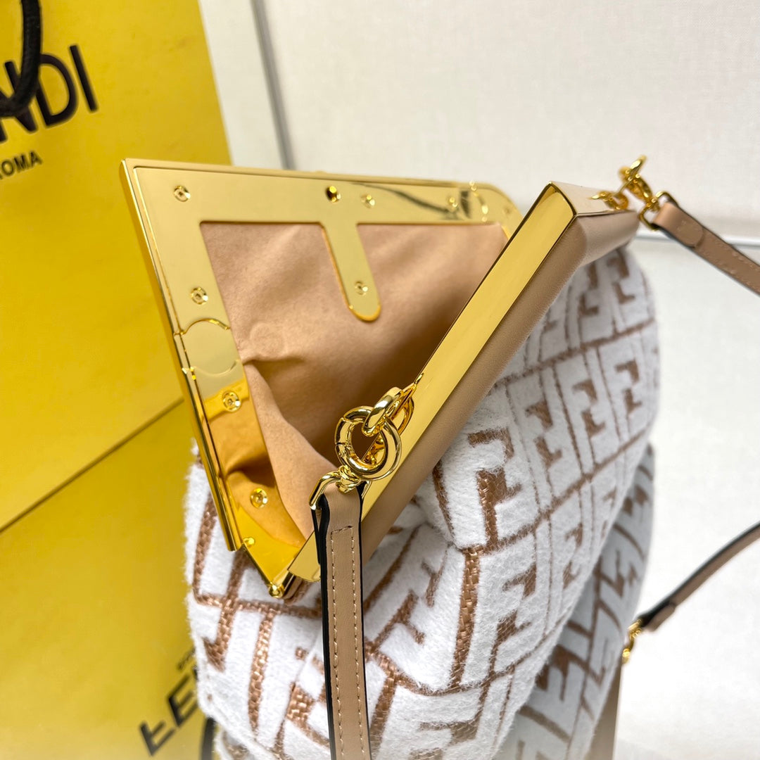 FIRST SMALL 26 IN WHITE WOOL AND CAMEL BROWN RAFFIA CALFSKIN TRIM
