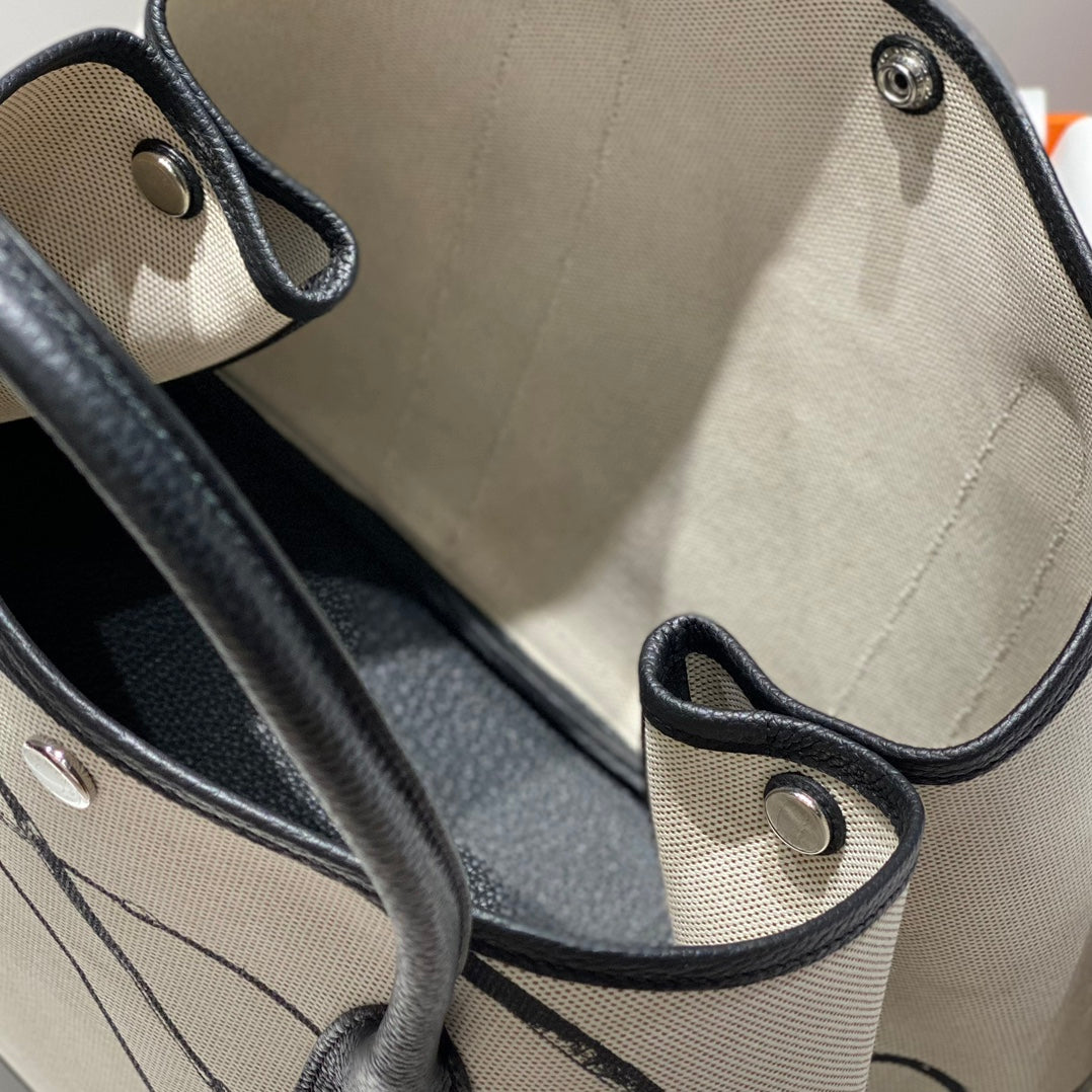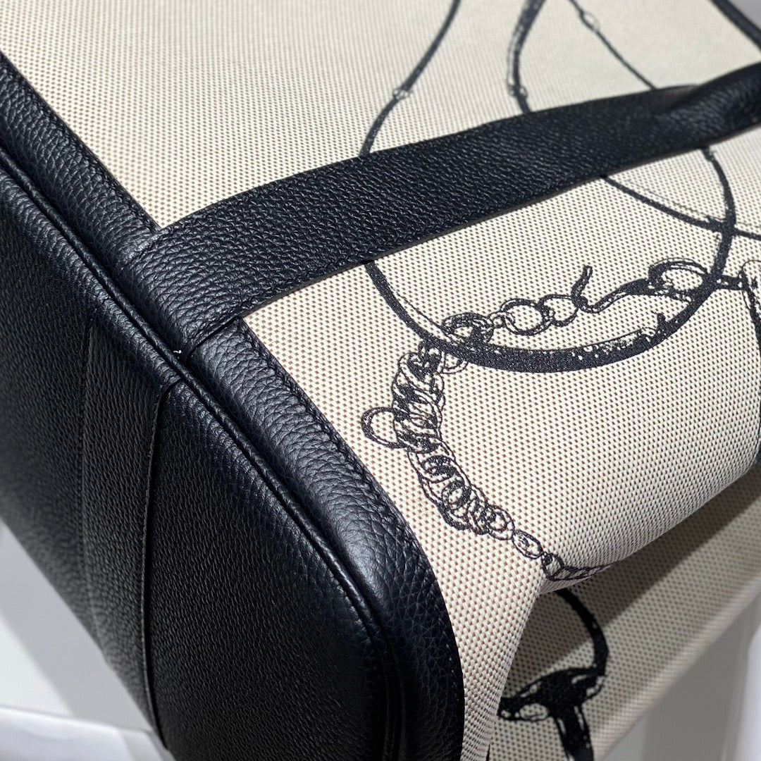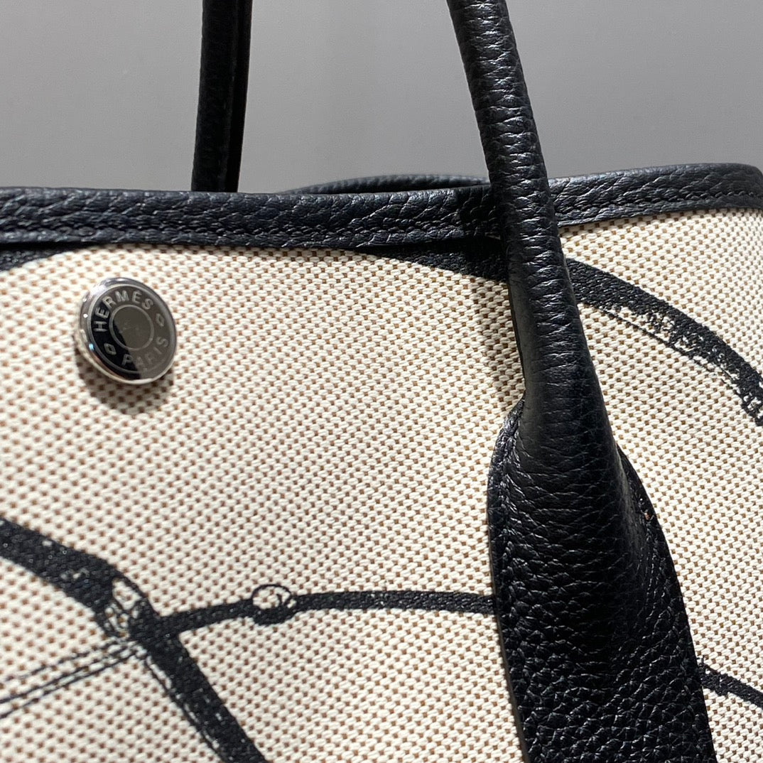 GARDEN PARTY 36 IN BEIGE AND BLACK TOILE H CANVAS BLACK CALFSKIN HORSE TACK SKETCH PRINT