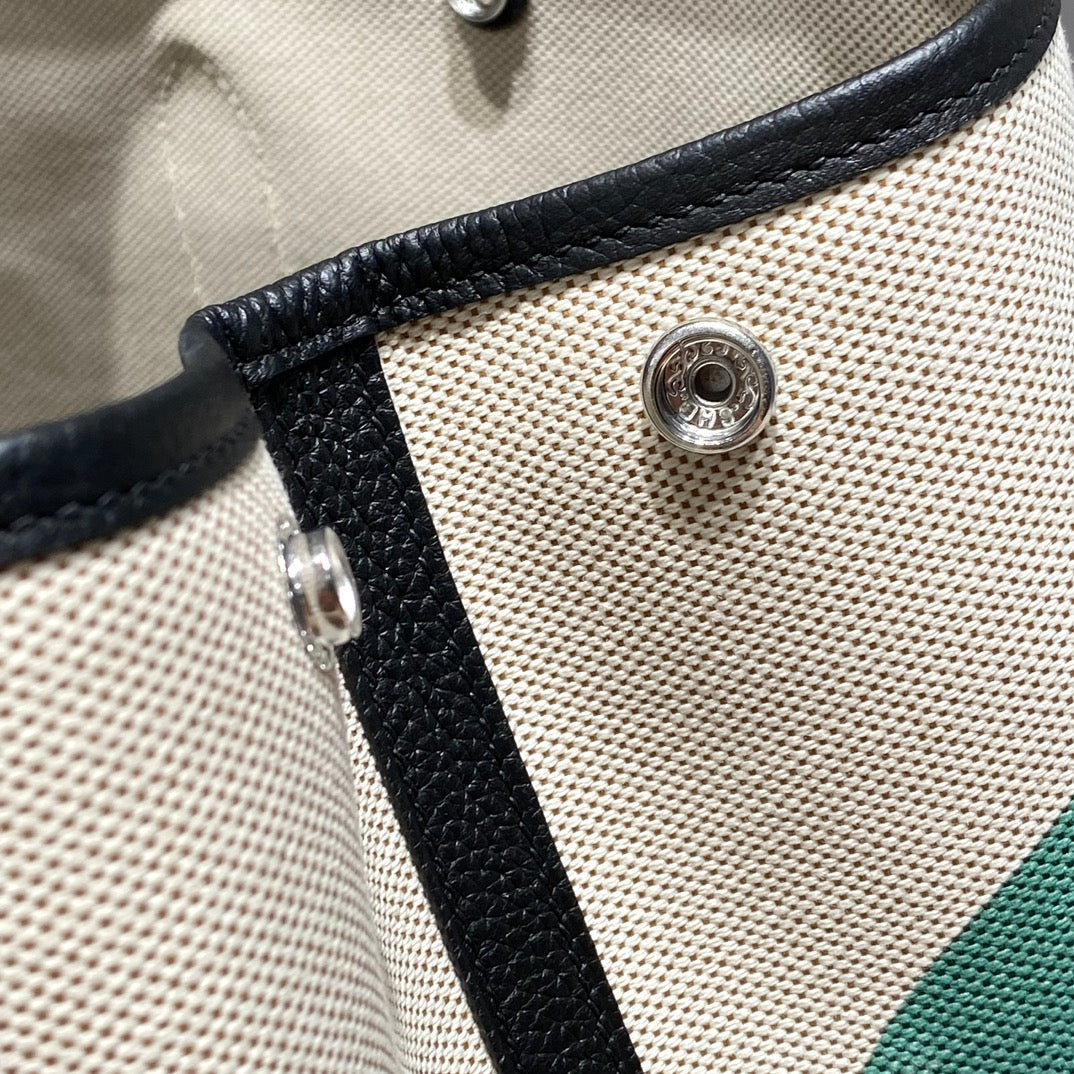 GARDEN PARTY 36 IN MULTICOLOR TOILE H CANVAS BLACK CALFSKIN OVERLAPPING POLKA RINGS PRINT