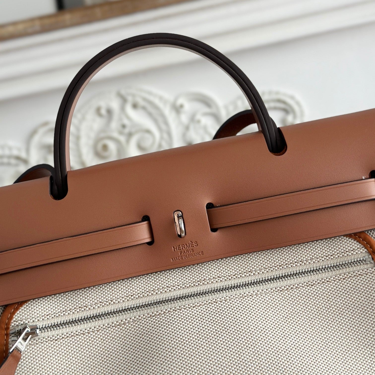 LARGE ANDIAMO 42 IN WHITE BROWN CALFSKIN AND CANVAS