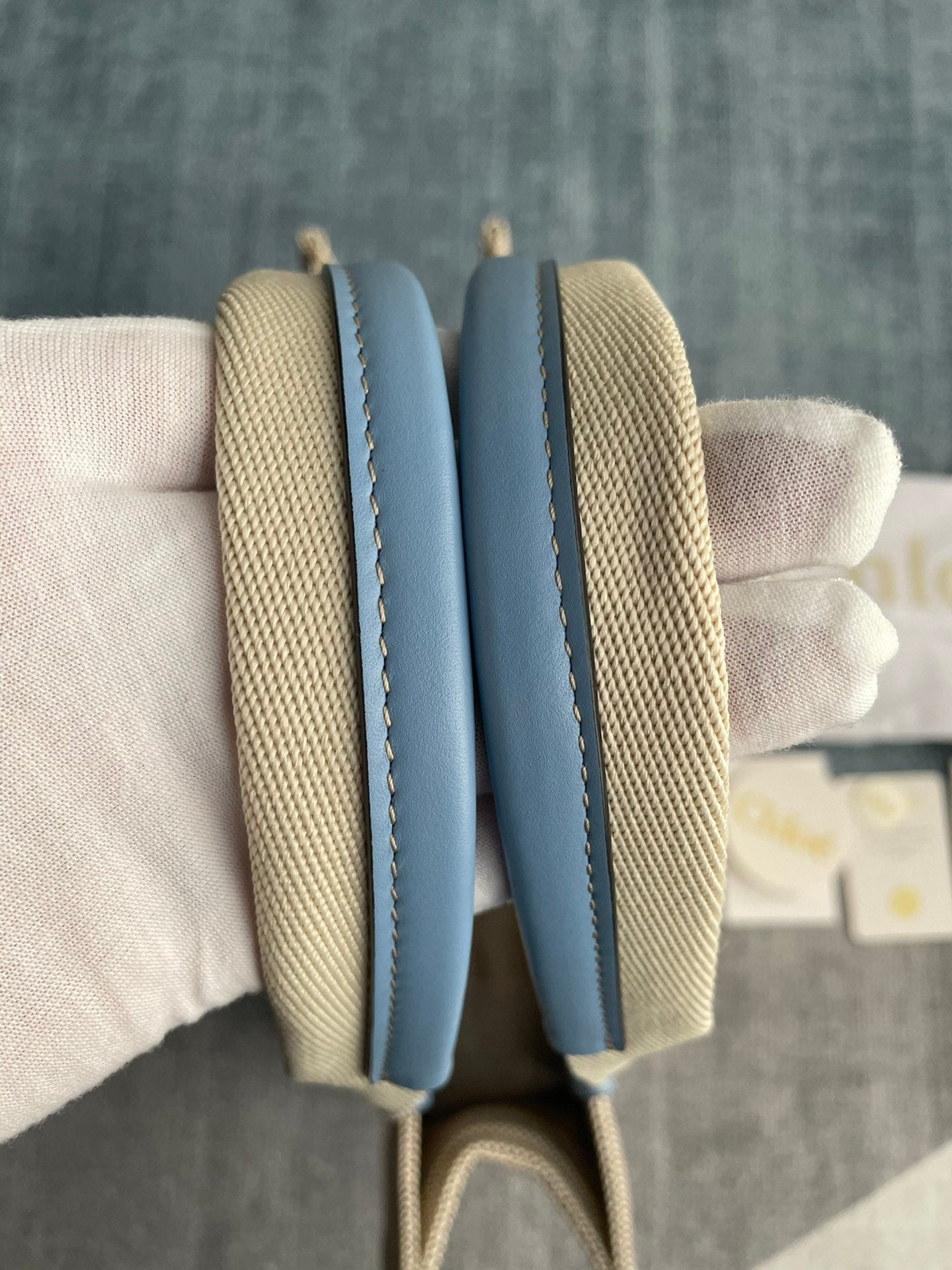 MEDIUM STRAP WOODY TOTE BAG 37 IN BEIGE LINEN CANVAS BLACK WEBBING LOGO EMBROIDER BLUE CALFSKIN