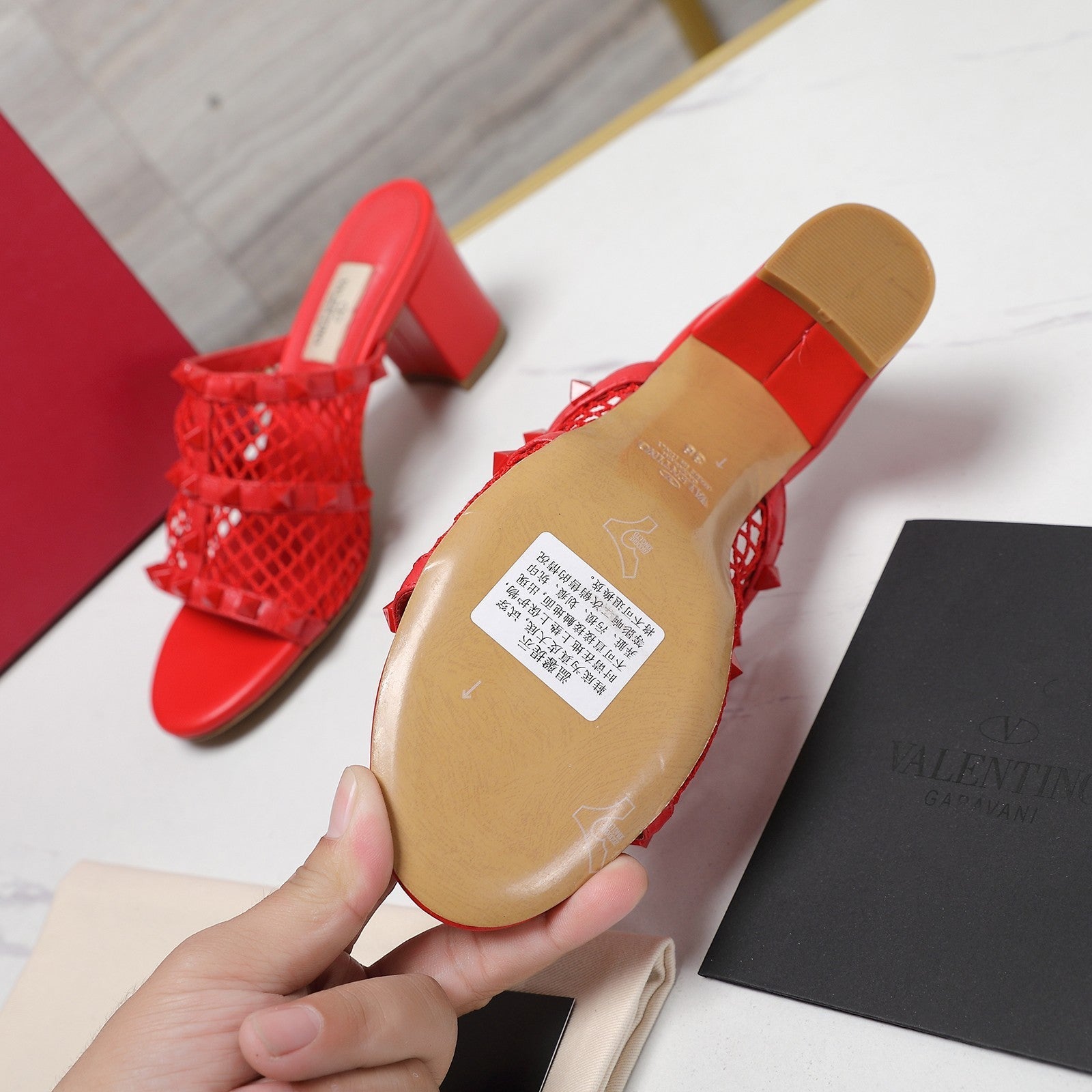 WOMEN'S BLACK ROCKSTUD CHERRY RED MESH SLIDER SANDAL WITH MATCHING STUDS 65 MM