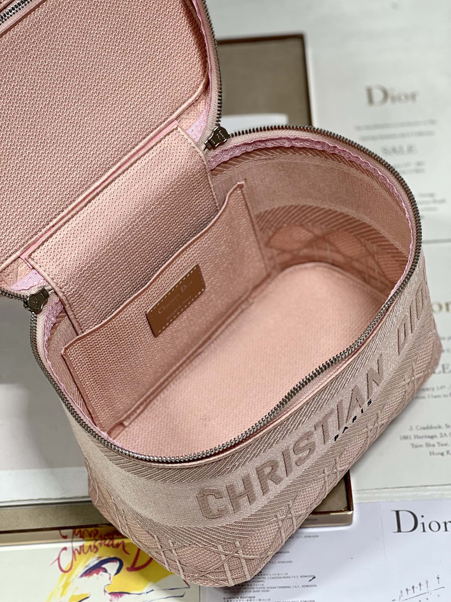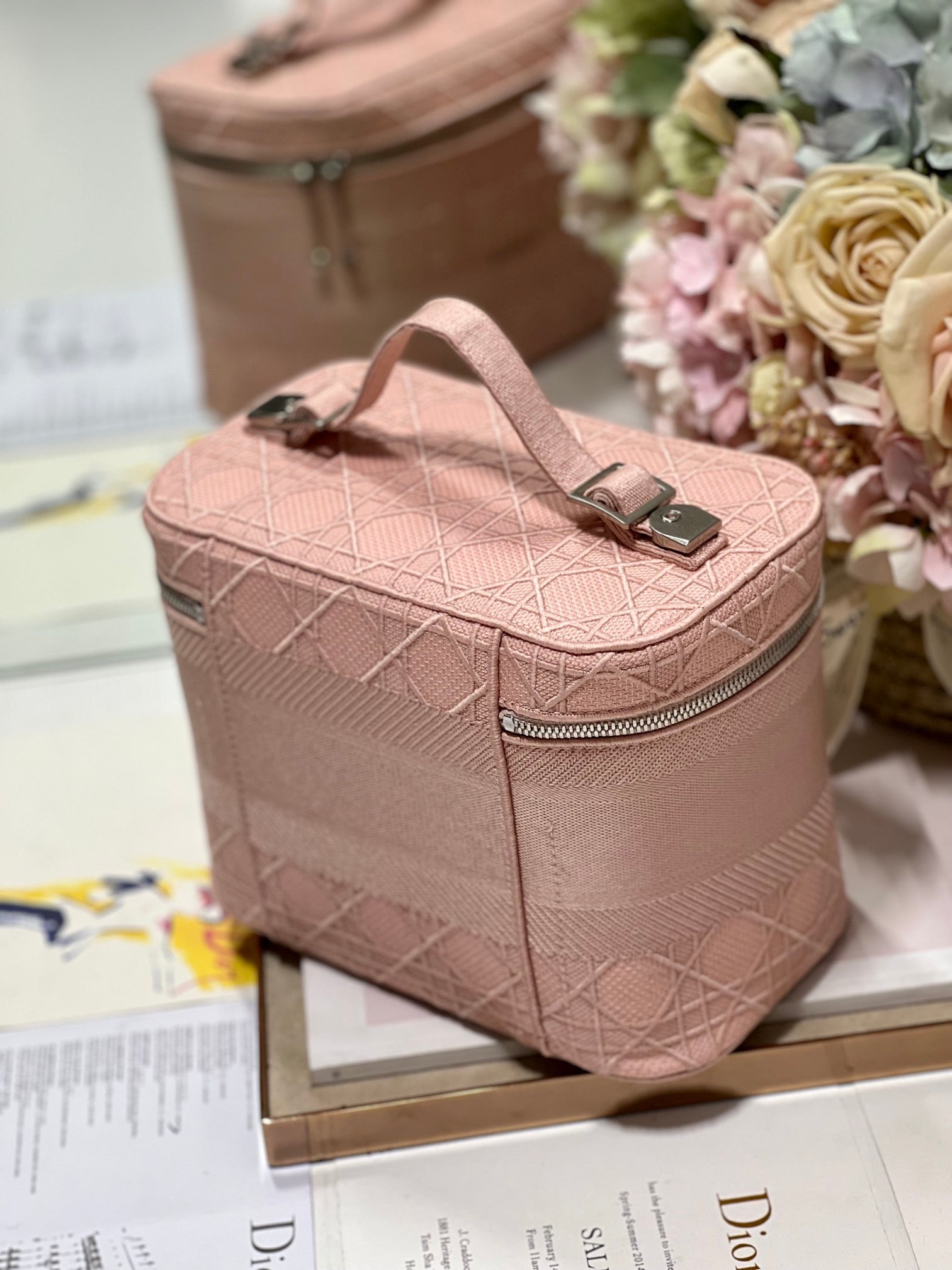 Dior's latest embroidered gray quilted vanity case—love at first sight! The round bag body is absolutely charming, featuring the newest quilted embroidery design that is both vintage and fashionable