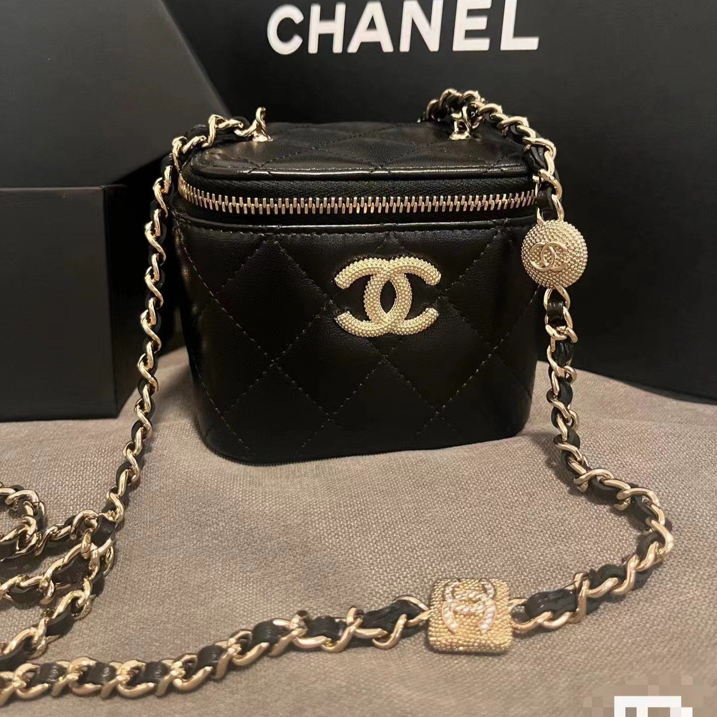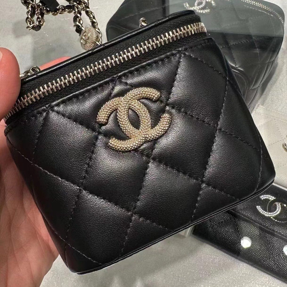 SMALL VANITY CASE 17 WITH HANDLE IN BLACK CALFSKIN GOLD METAL CHAIN