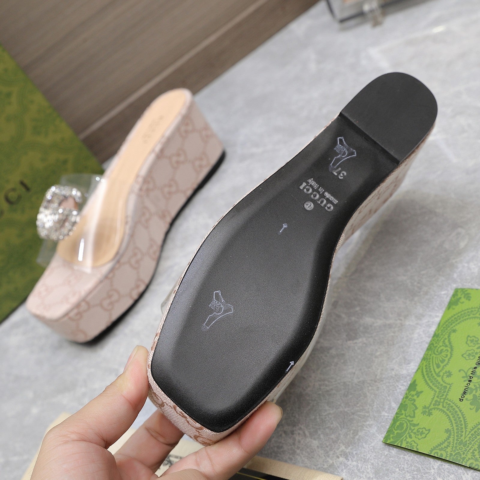 • HIGH WEDGE PLATFORM IN ALMOND BEIGE CANVAS WITH DOUBLE CRYSTAL G BUCKLE