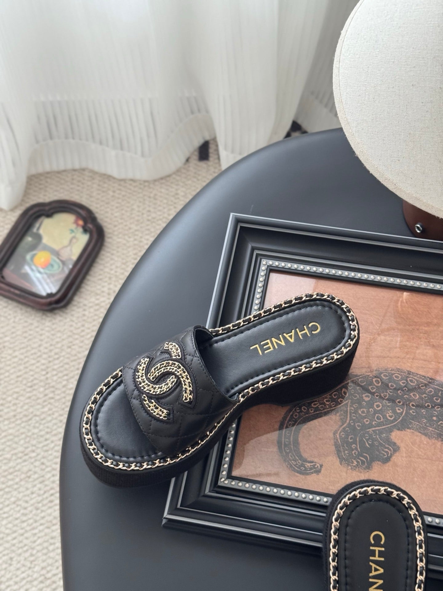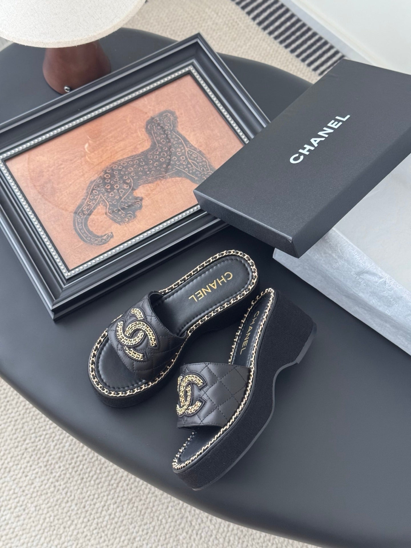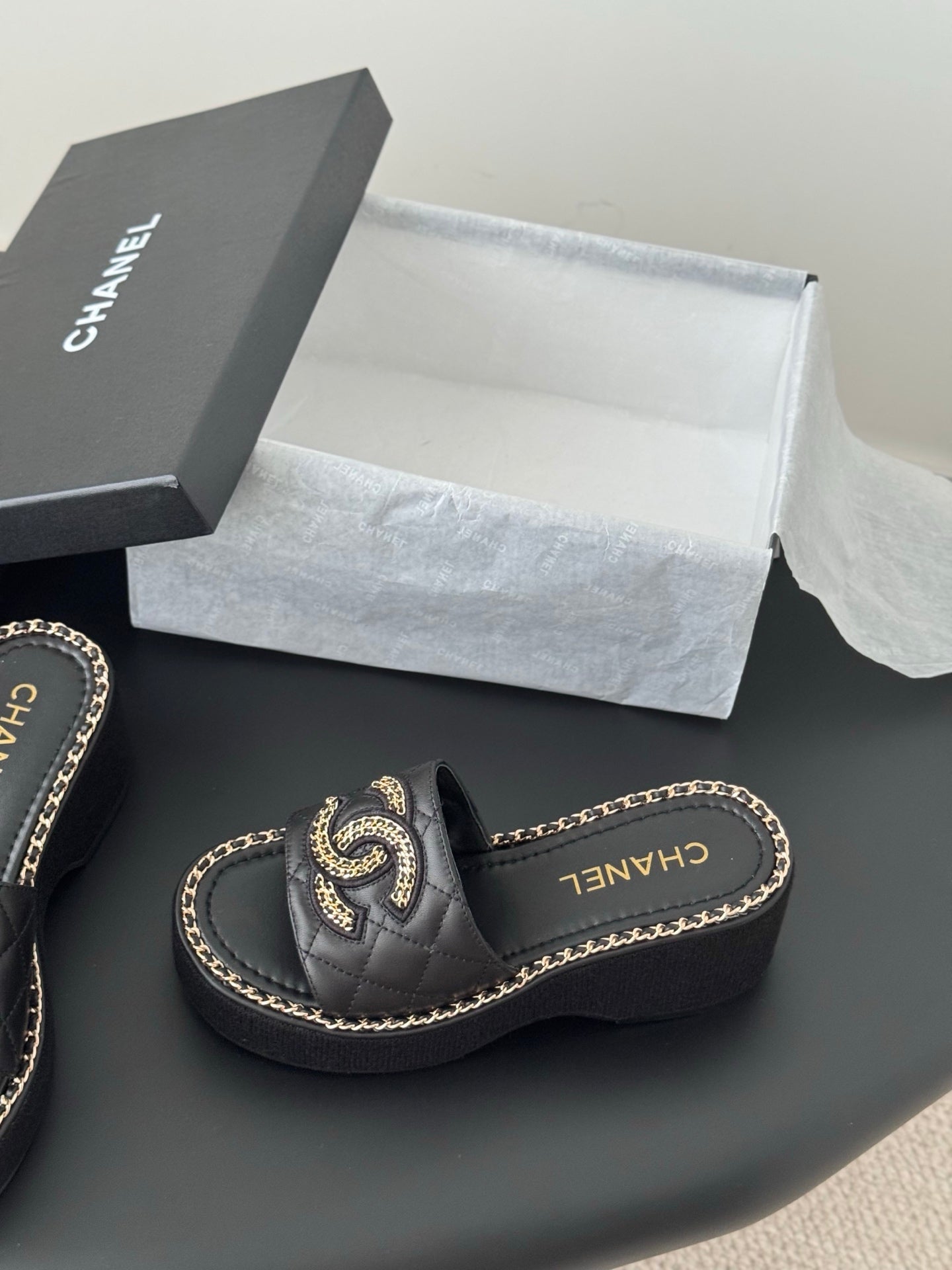 WEDGE HEELS IN BLACK CALFSKIN MIX CHAIN BASE