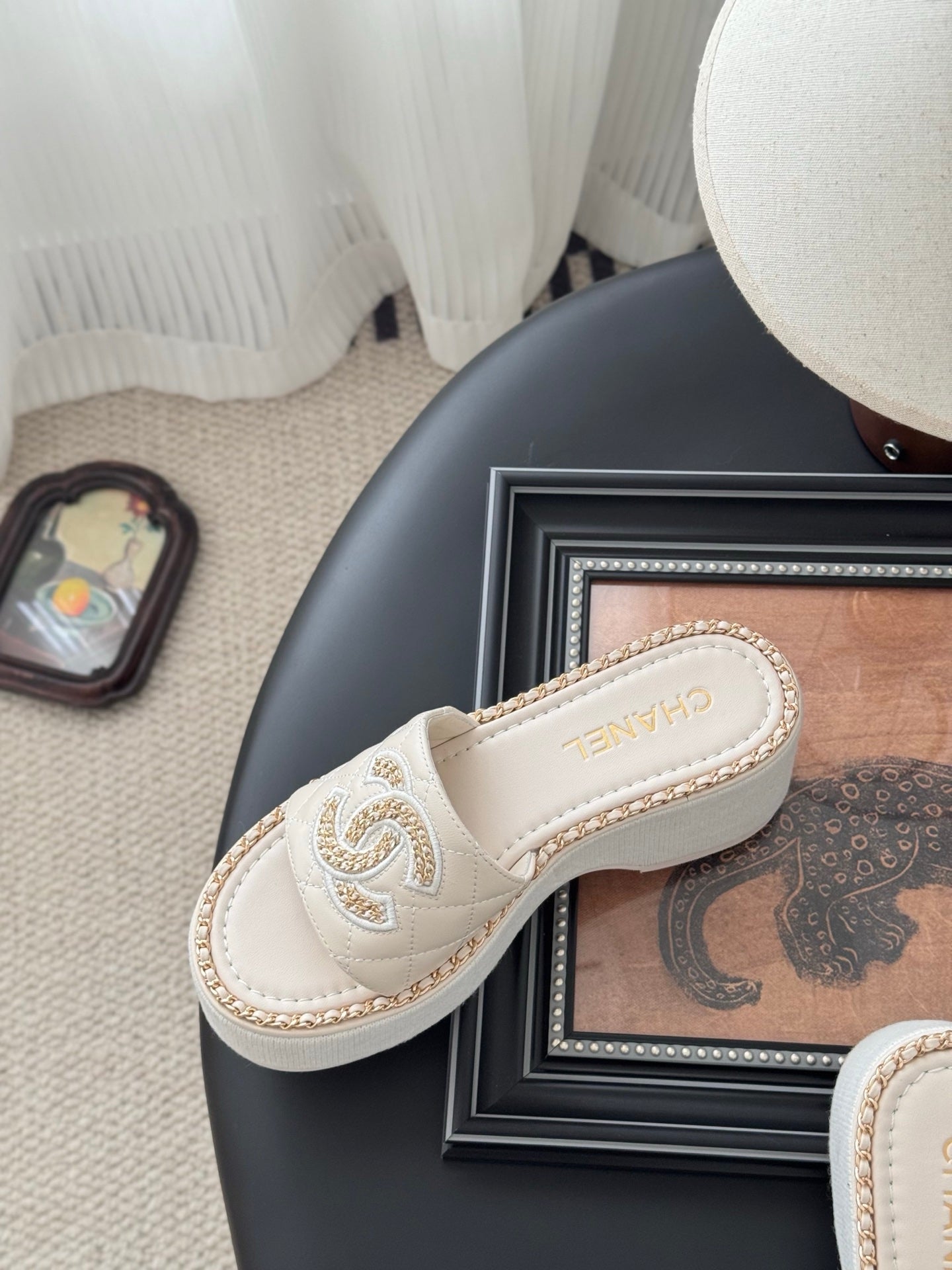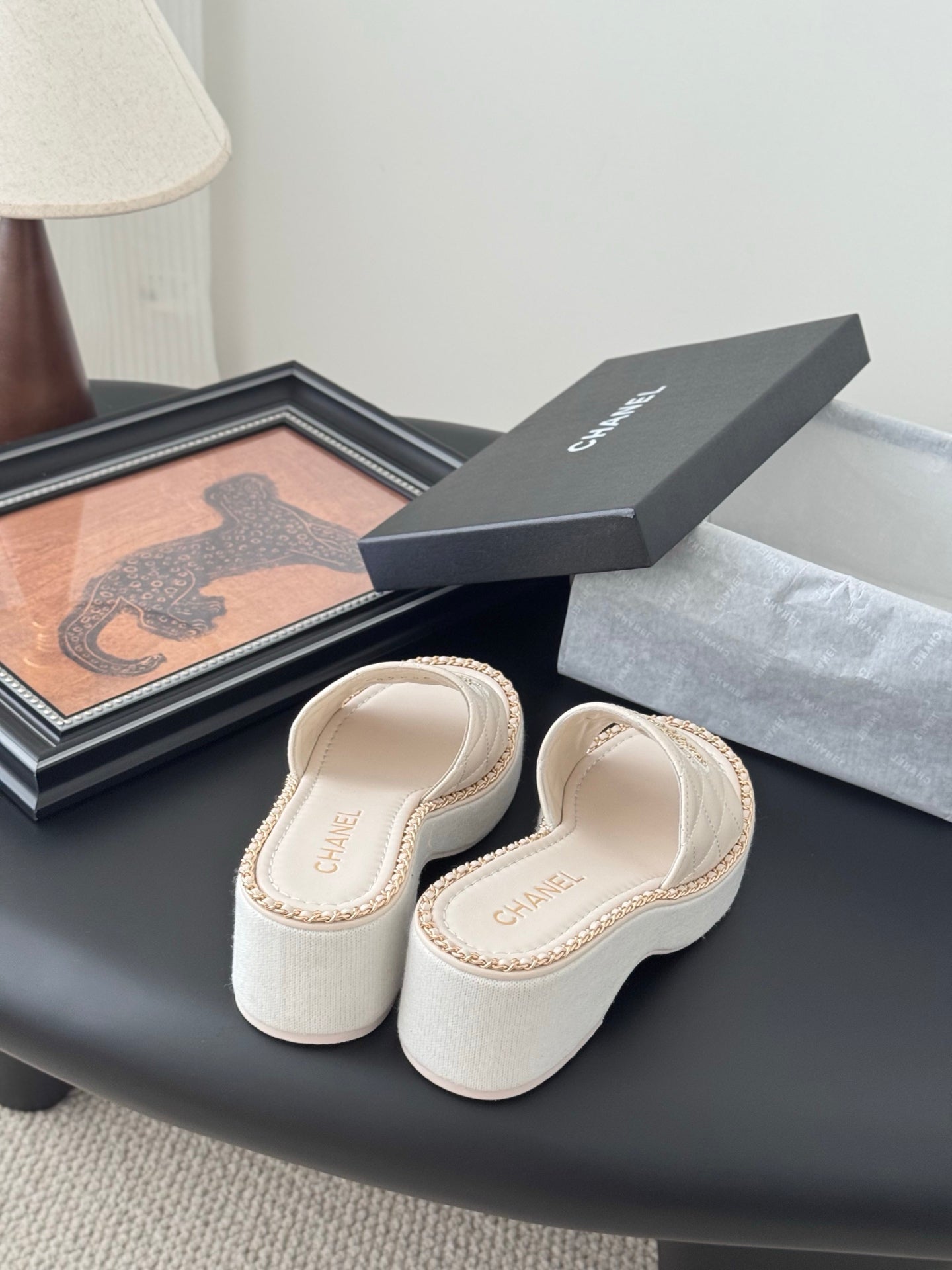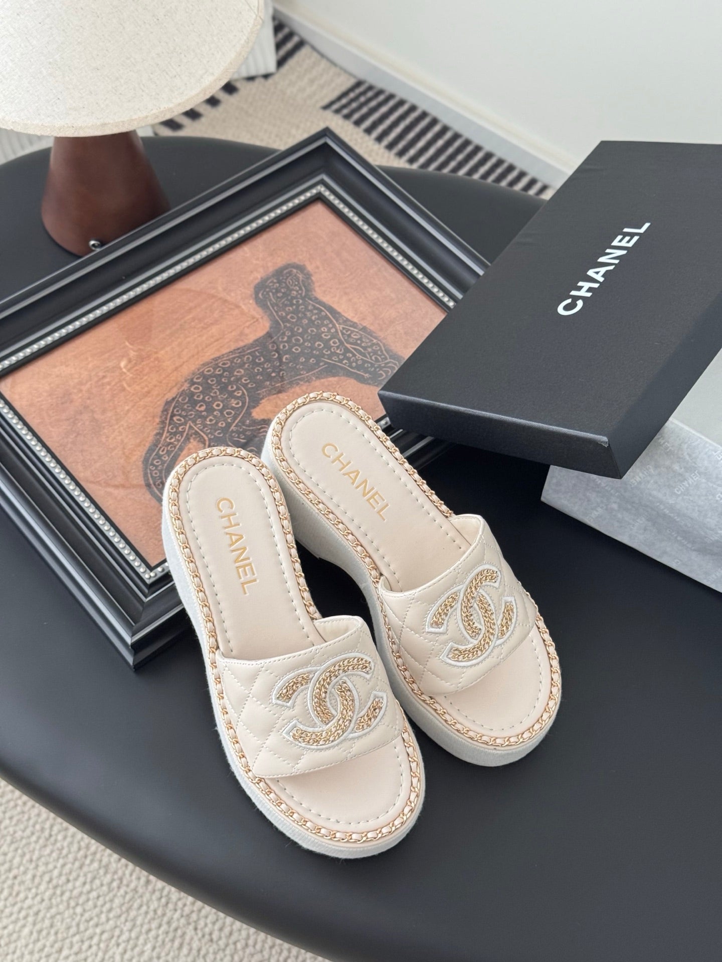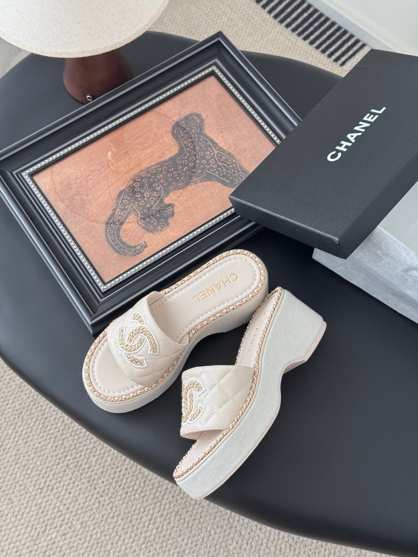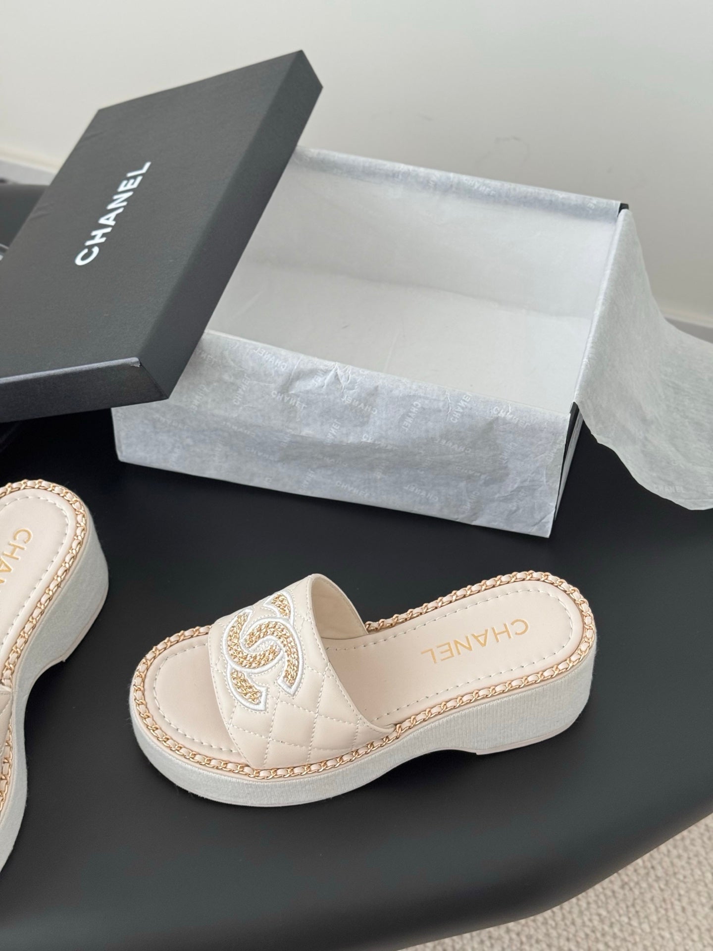 WEDGE HEELS IN HIGHT BEIGE CALFSKIN MIX CHAIN BASE